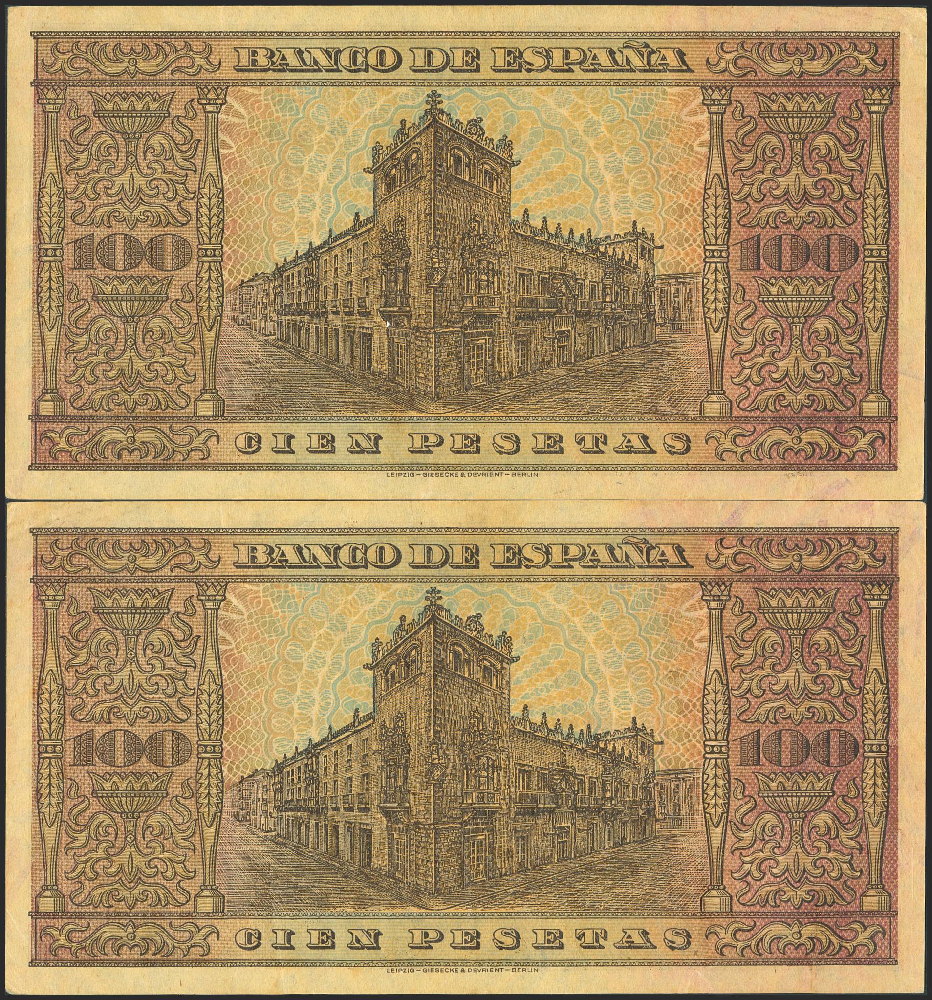 100 Pesetas. May 20, 1938. Consecutive pair. Series D. (Edifil 2023: 432a). VF+.