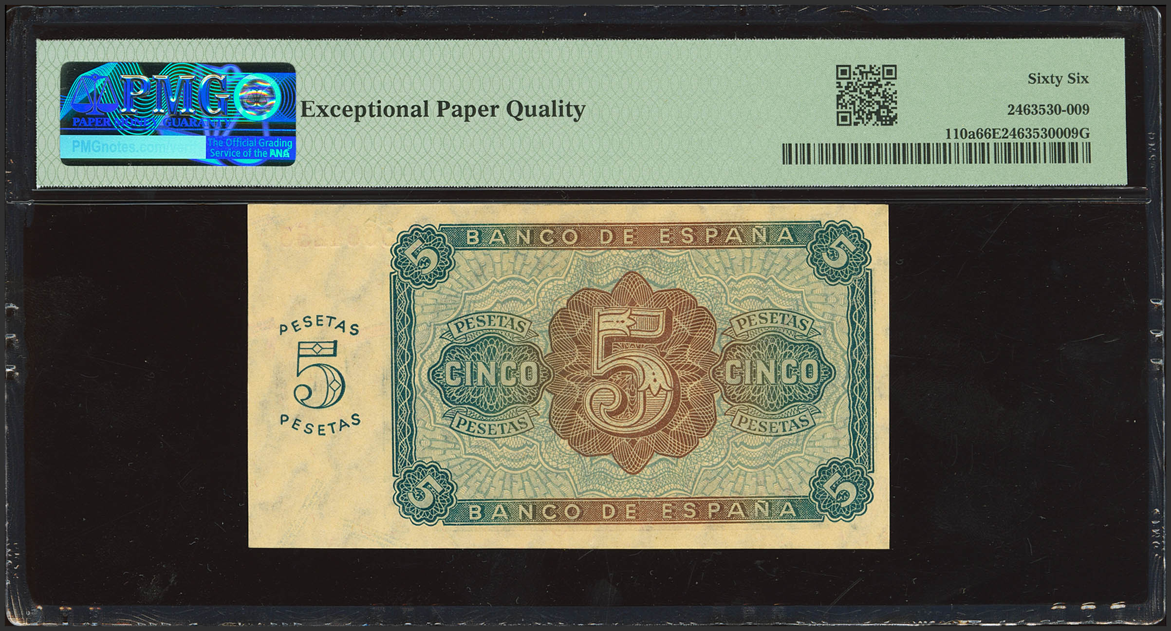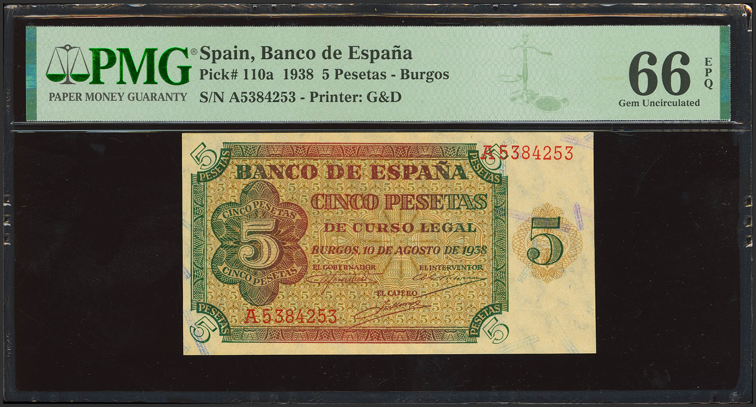 5 Pesetas. August 10, 1938. Series A. (Edifil 2023: 435). Rare in this exceptional condition. Uncirculated. Encapsulated PMG66EPQ.