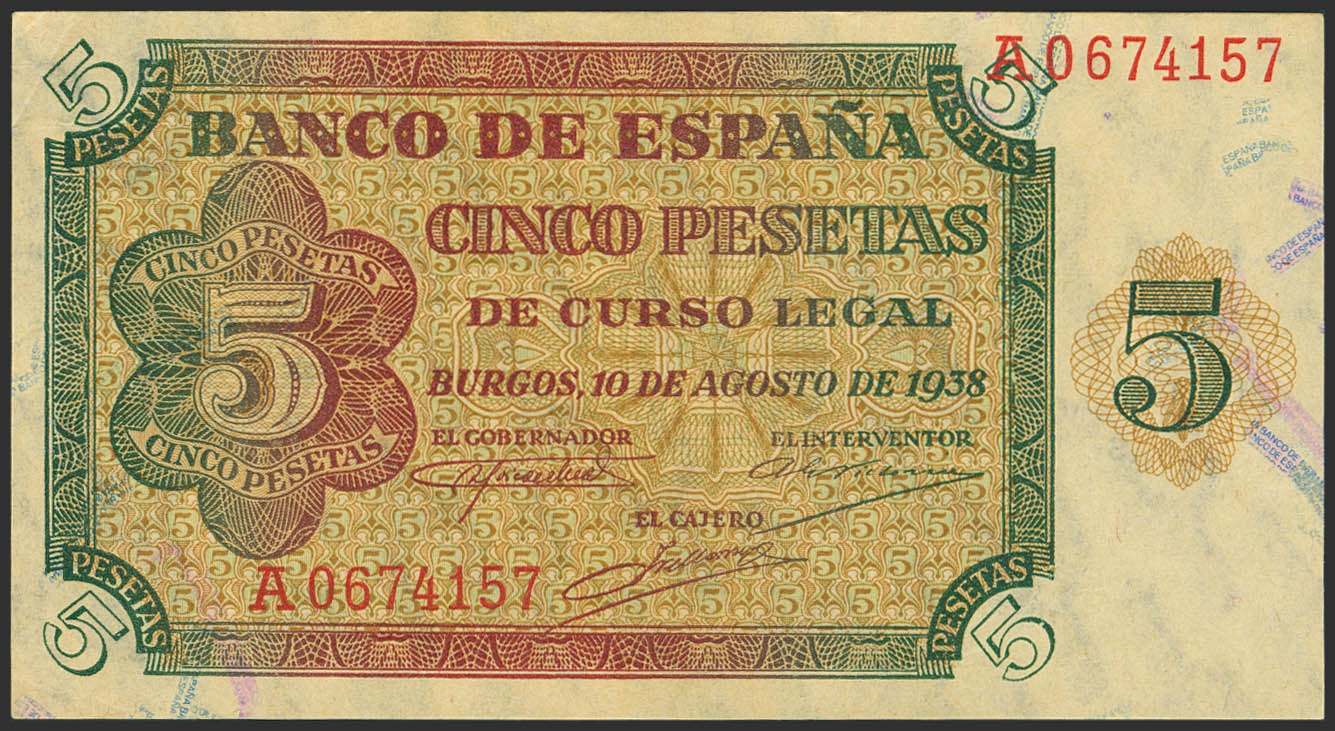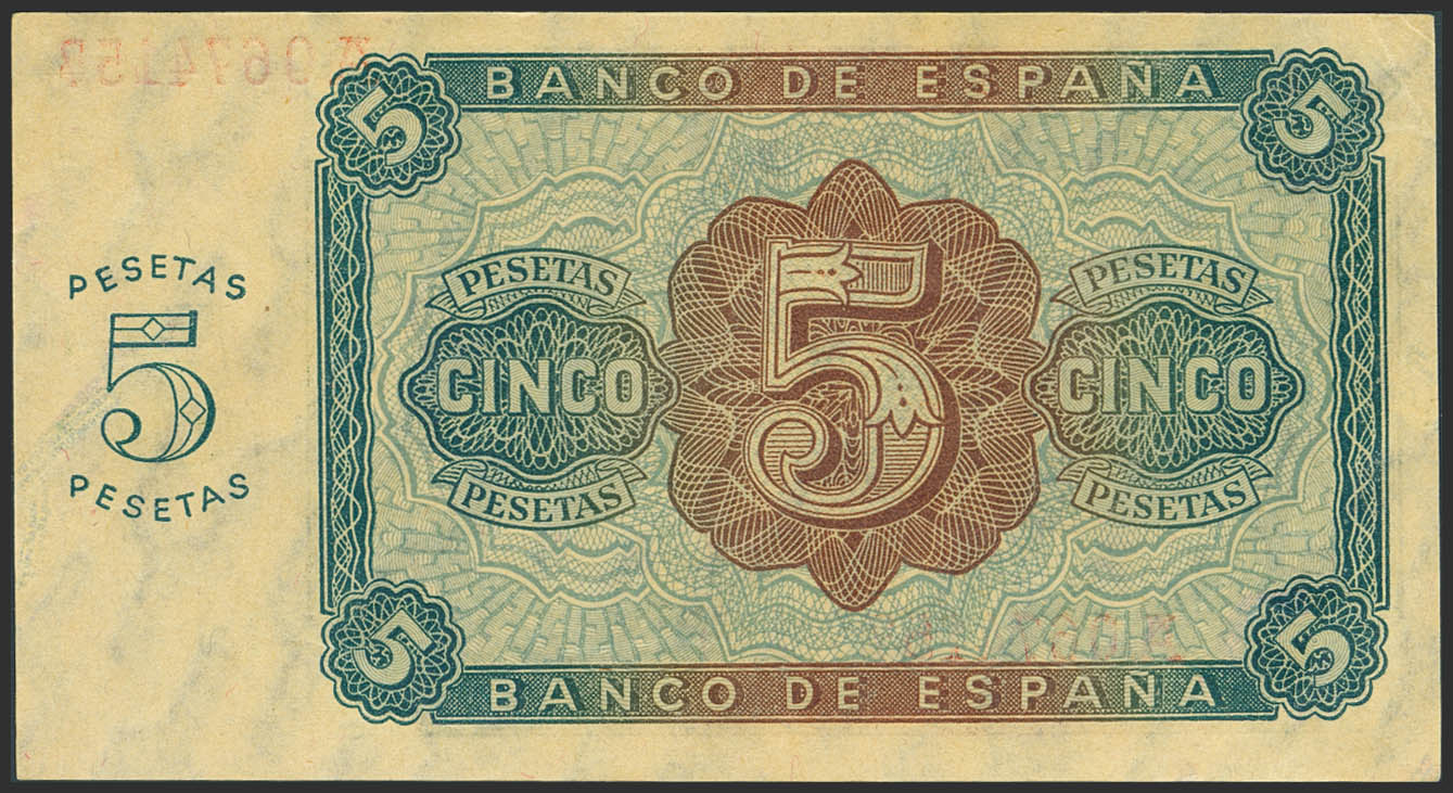 English 5 Pesetas. August 10, 1938. Series A. (Edifil 2023: 435). Original finish. Uncirculated-.