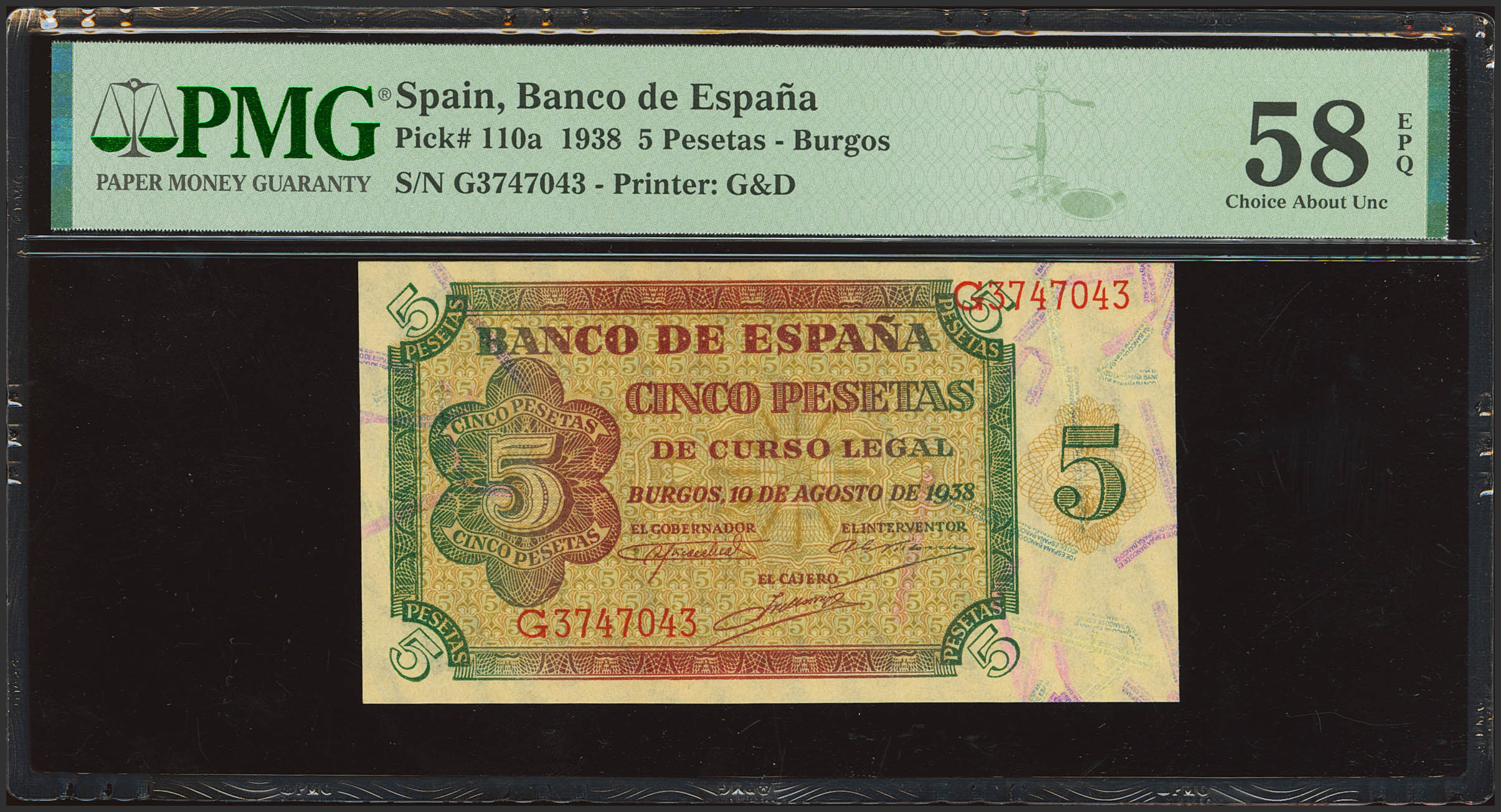 English 5 Pesetas. August 10, 1938. Series G. (Edifil 2023: 435a, Pick: 110a). Original finish. Good Extremely Fine++. PMG58EPQ capsule.