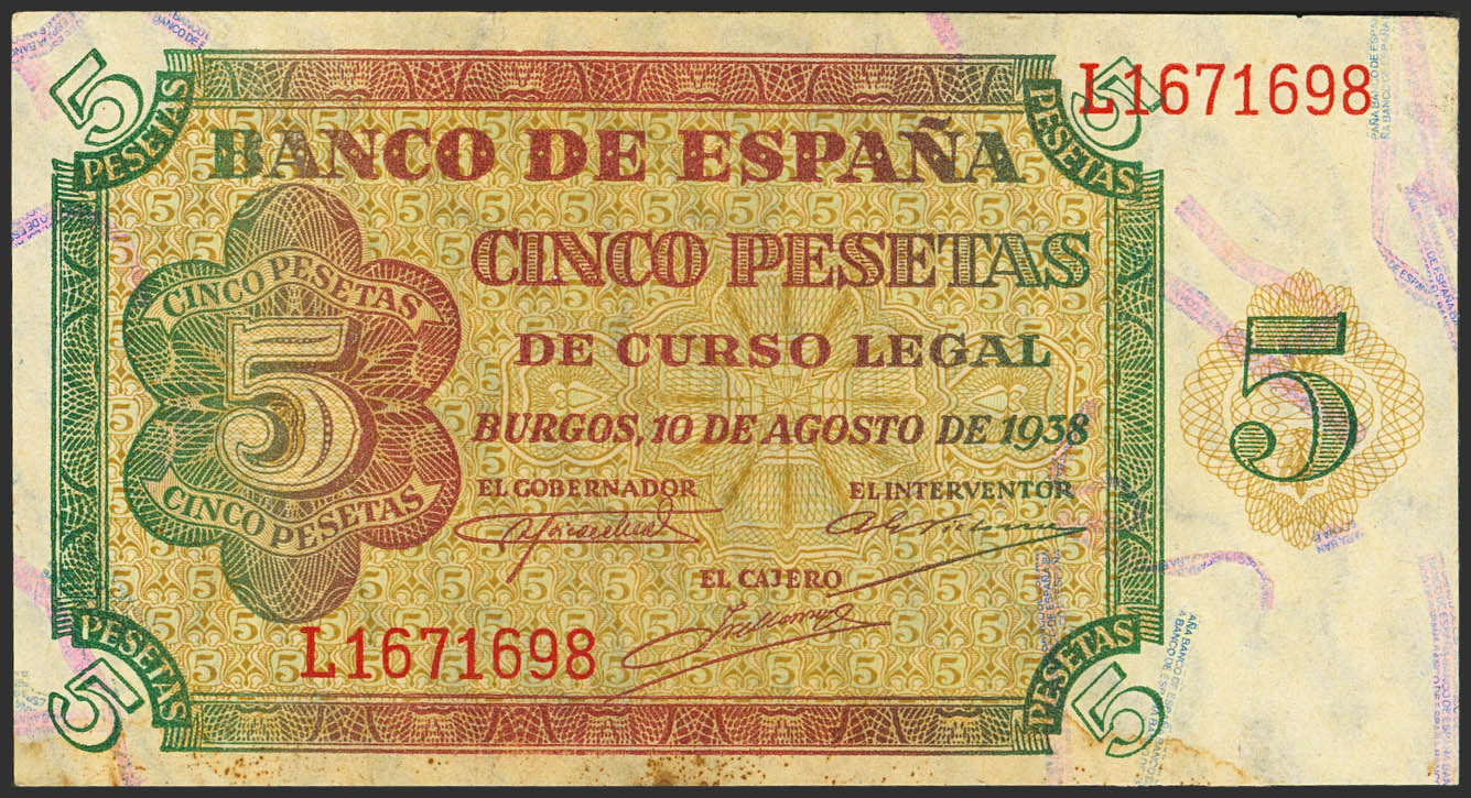 English 5 Pesetas. August 10, 1938. Series L. (Edifil 2023: 435a). Age stains. EF-.