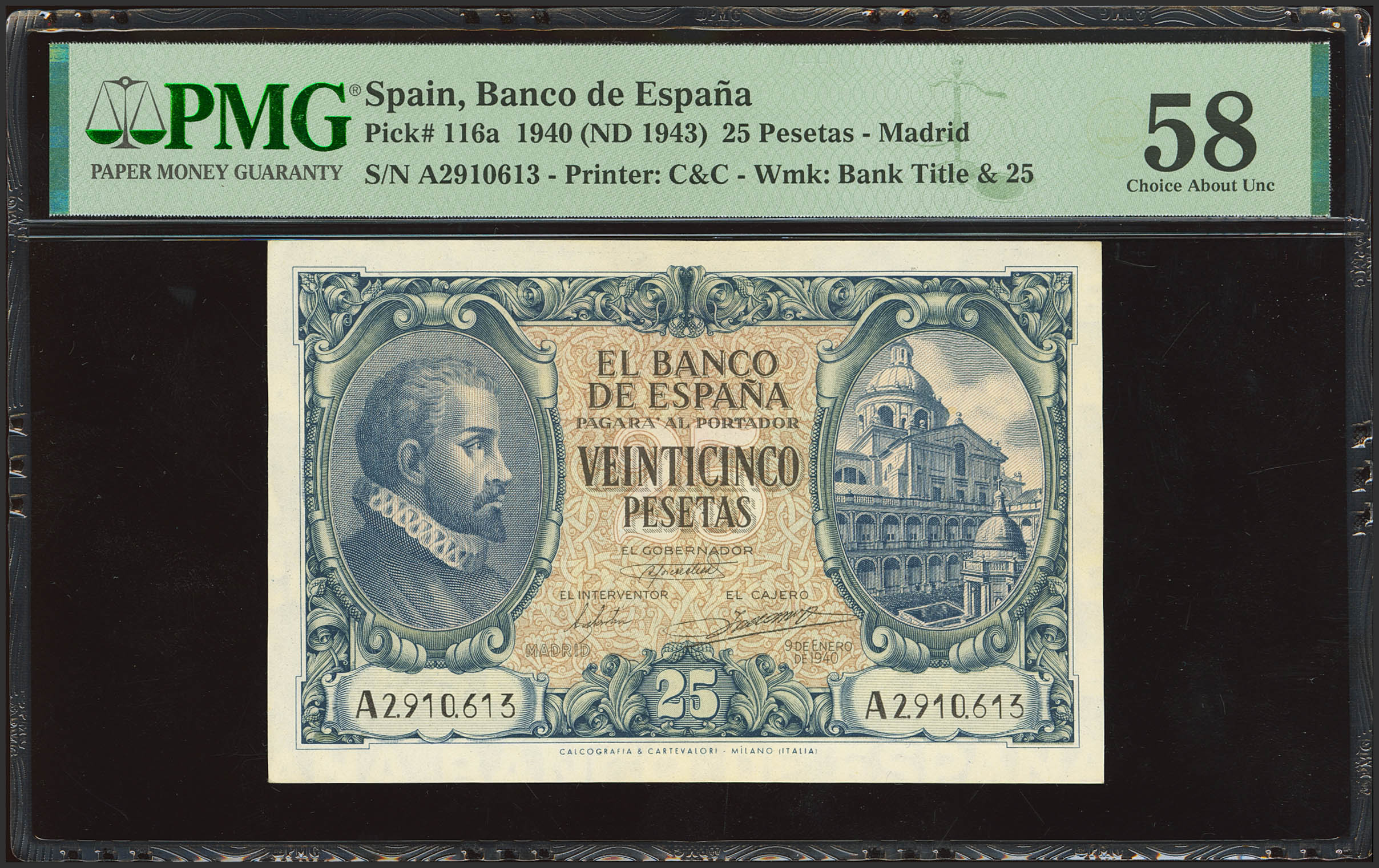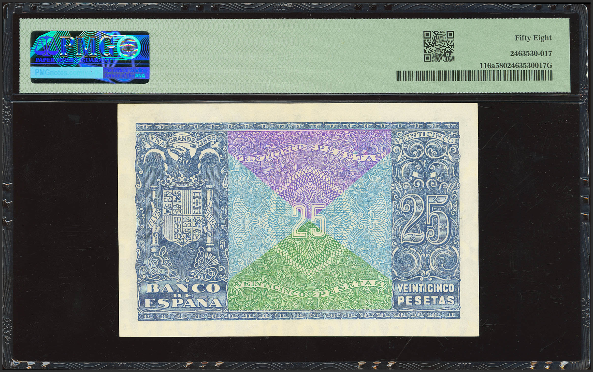 English 25 Pesetas. January 9, 1940. Series A. (Edifil 2023: 436, Pick: 116a). Rare. EF++. PMG58 package.