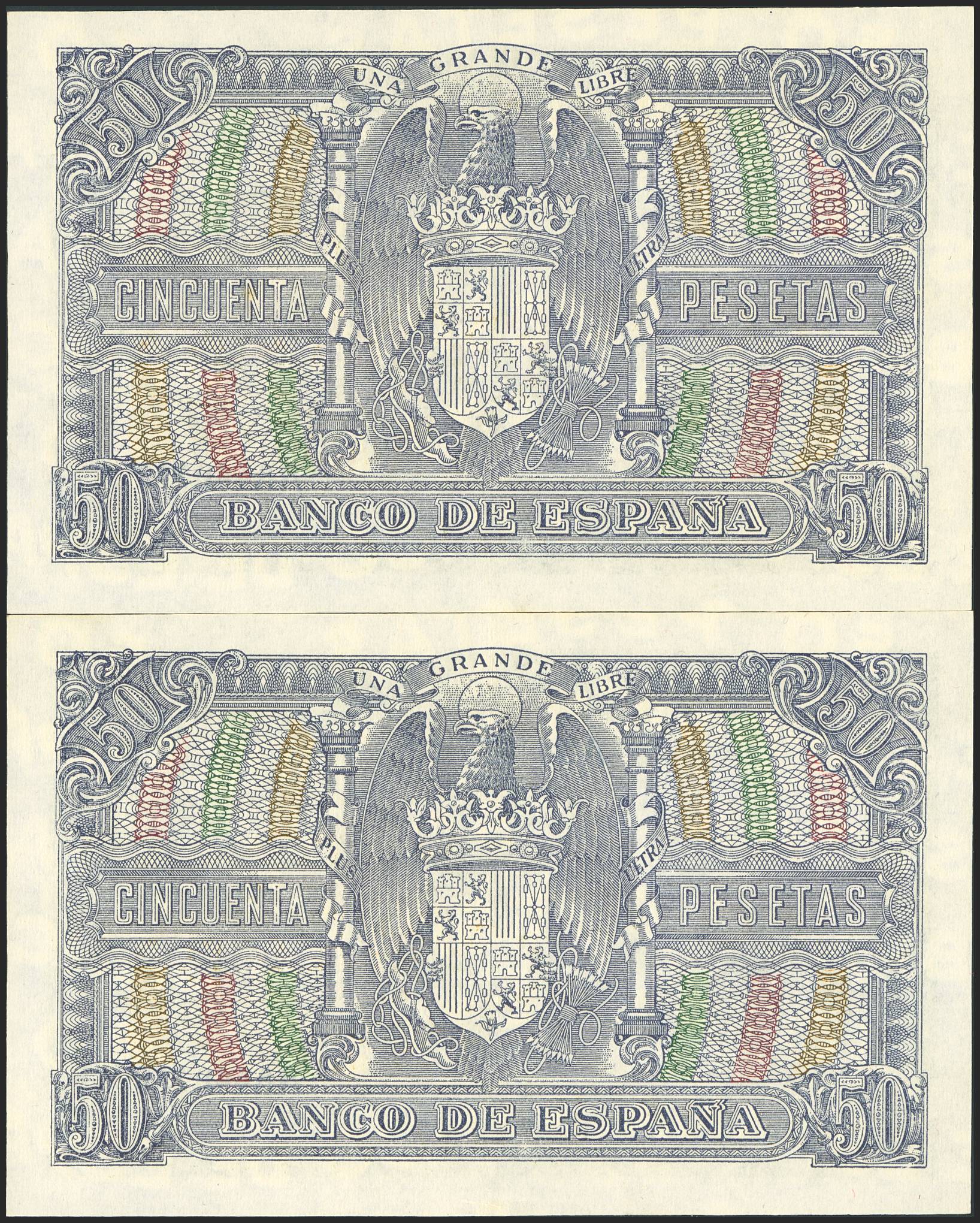 English 50 Pesetas. January 9, 1940. Consecutive pair. Series A. (Edifil 2023: 437). Retains much of its original finish. EF+.