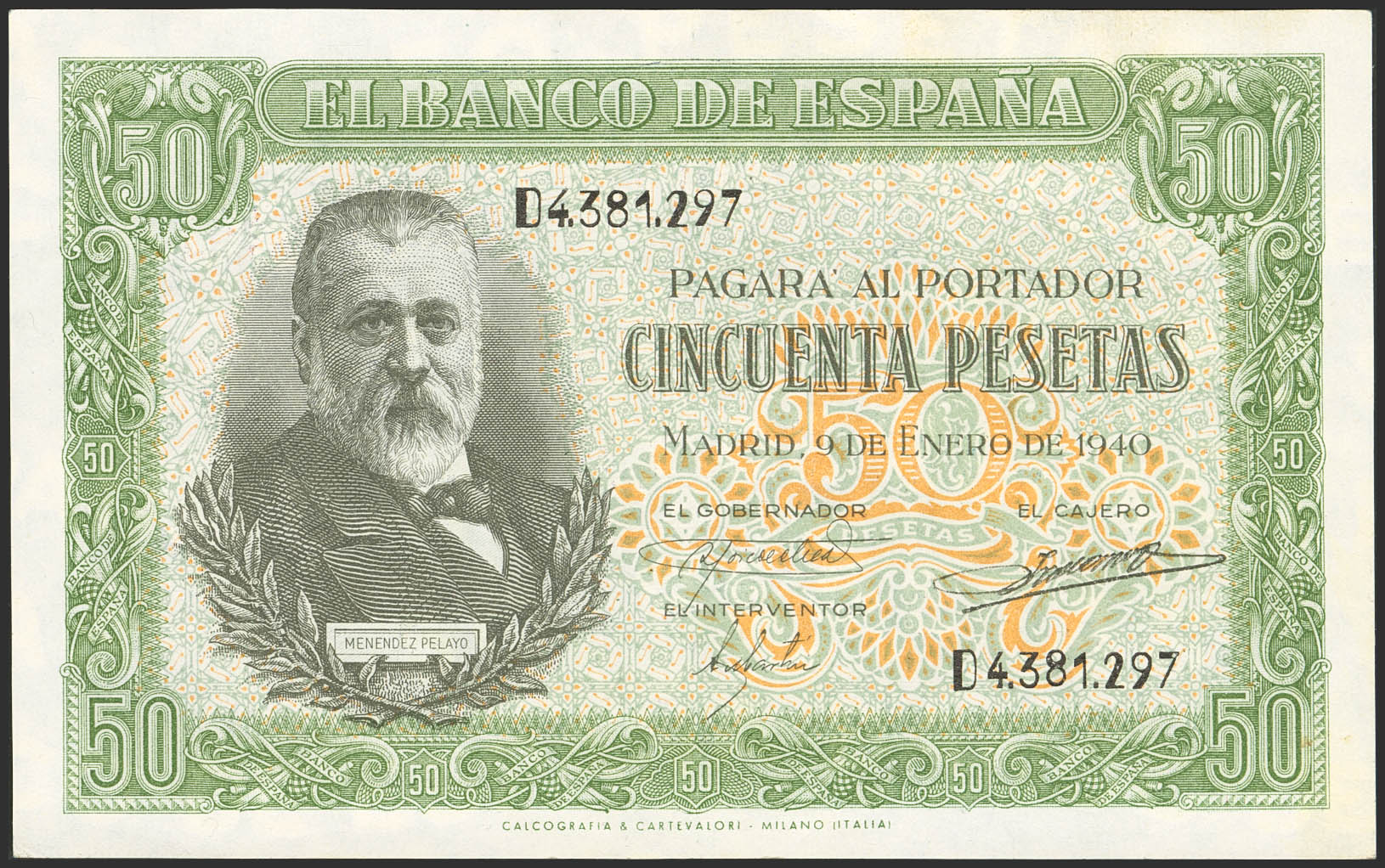 English 50 Pesetas. January 9, 1940. Series D. (Edifil 2023: 437a). Original finish. Uncirculated-.