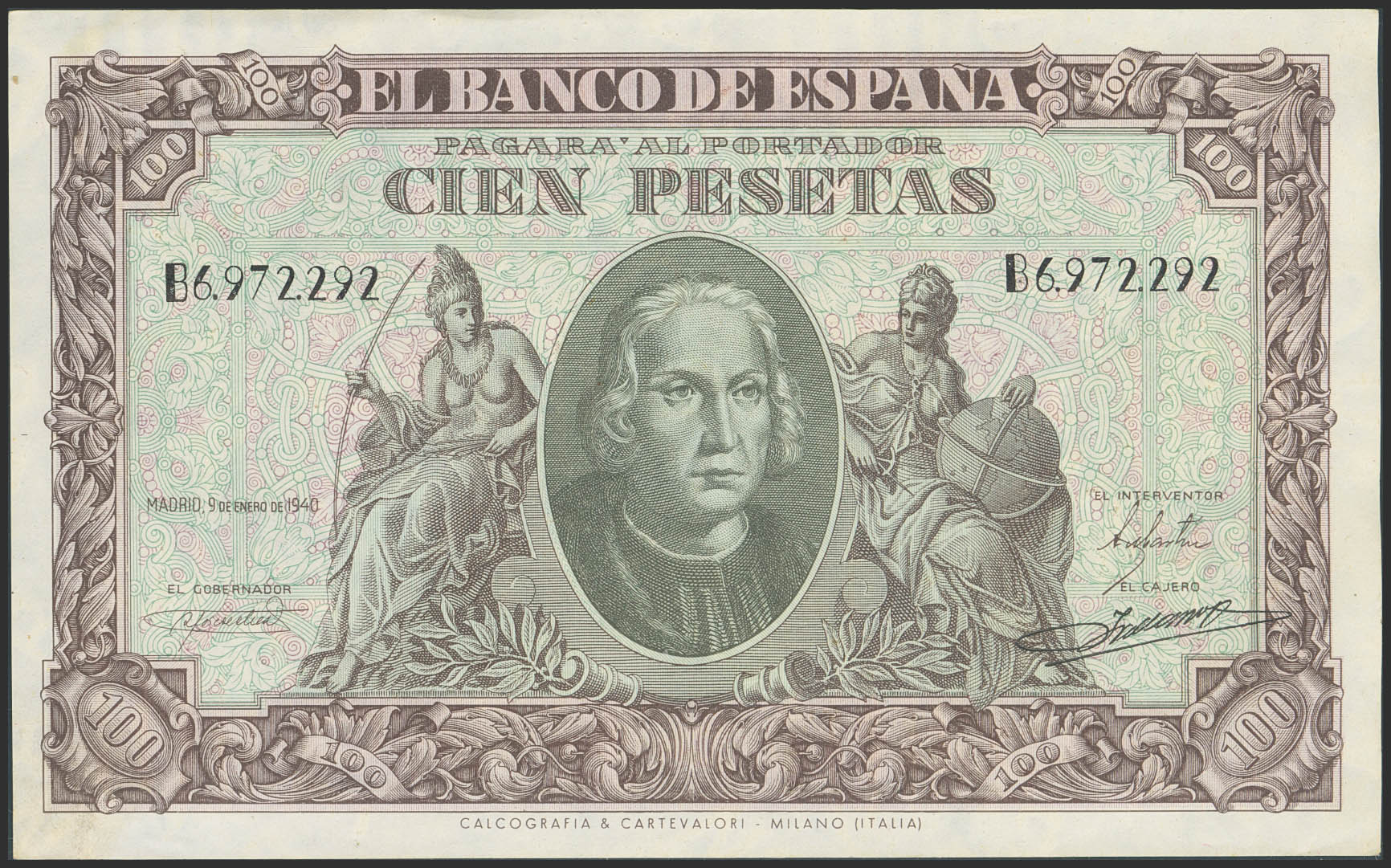 100 Pesetas. January 9, 1940. Series B. (Edifil 2023: 438a). Original finish. Uncirculated-.
