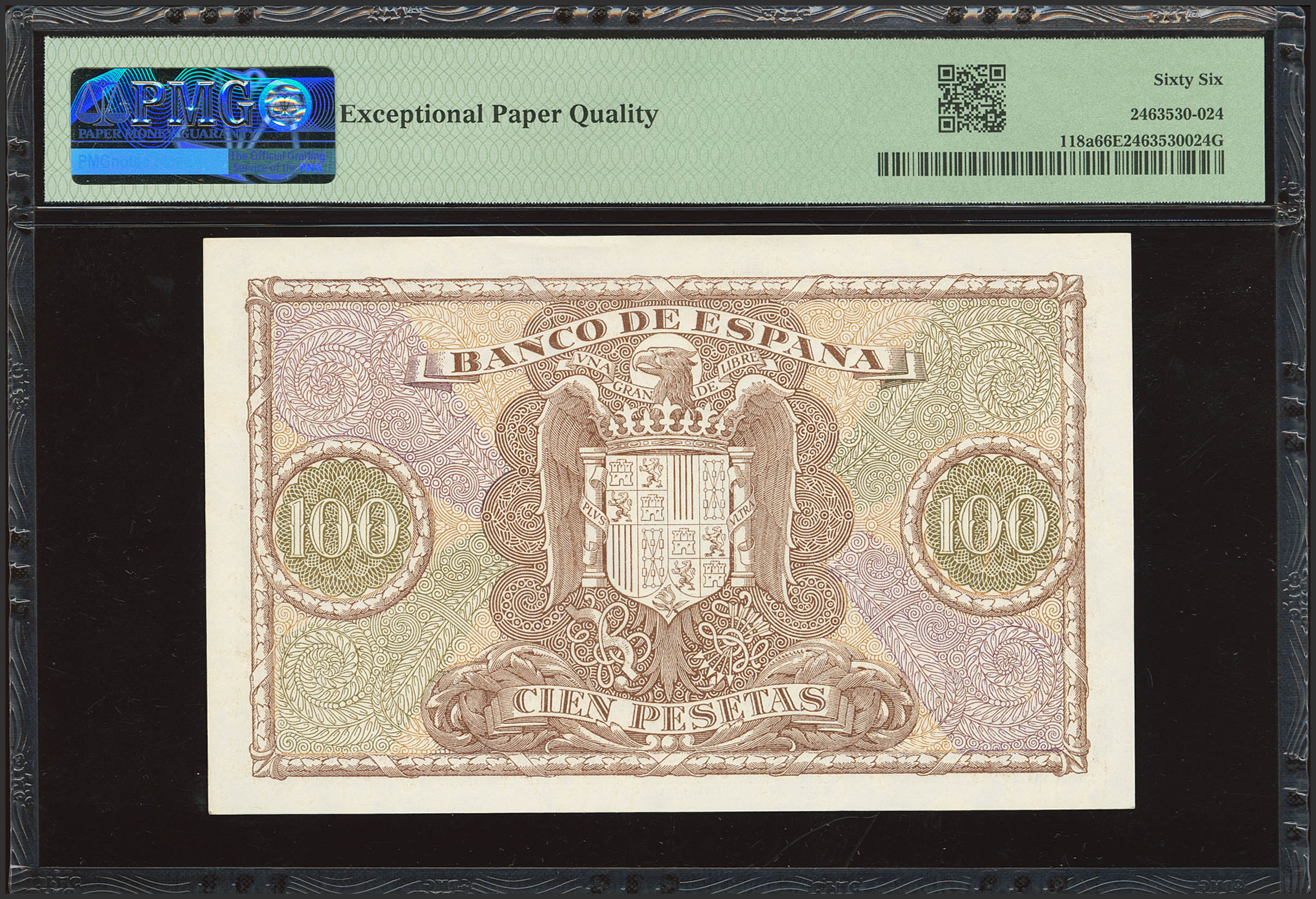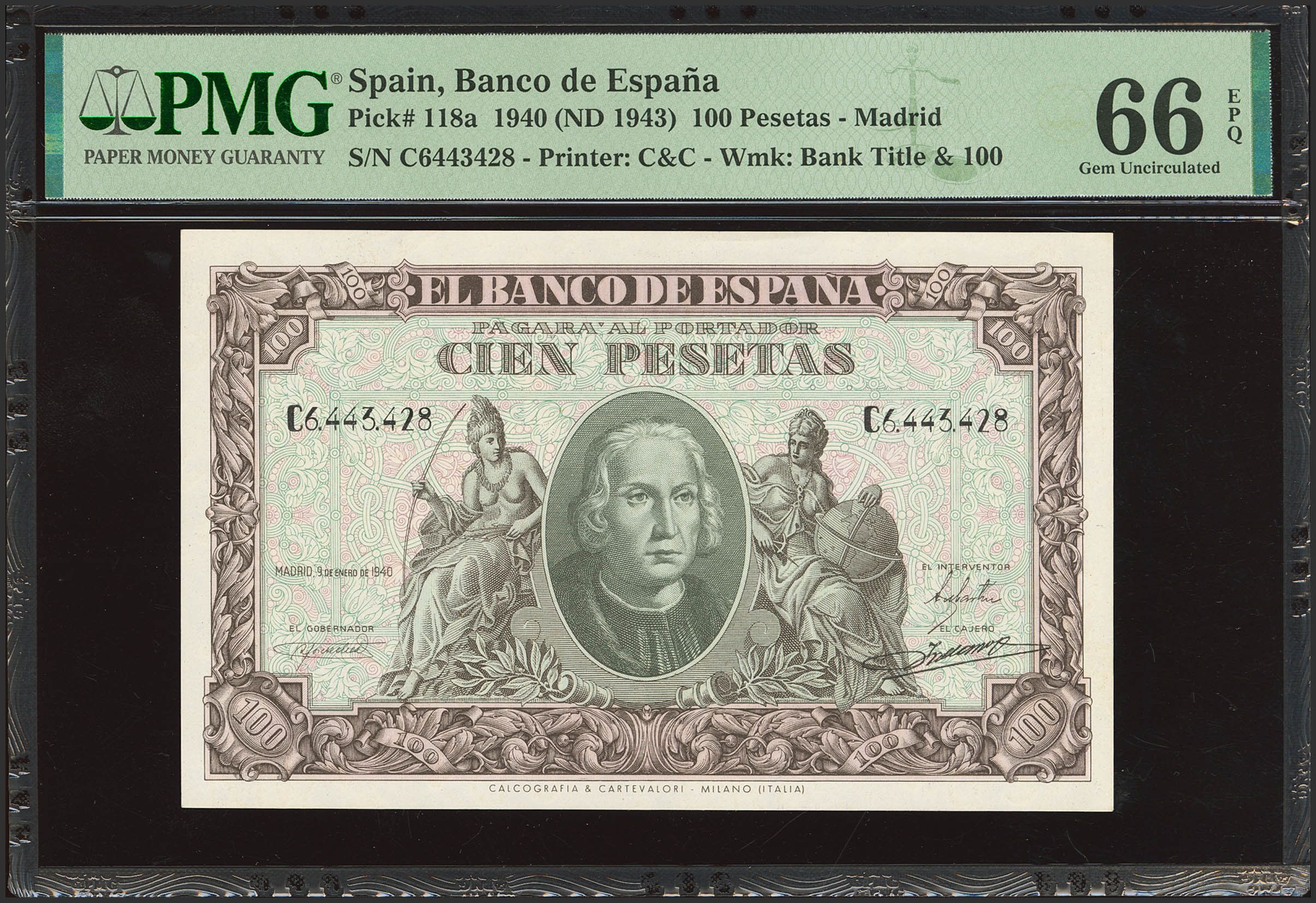 100 Pesetas. January 9, 1940. Series C. (Edifil 2023: 438a, Pick: 118a). Very rare in this exceptional condition, original finish. Uncirculated. Encapsulated PMG66EPQ.