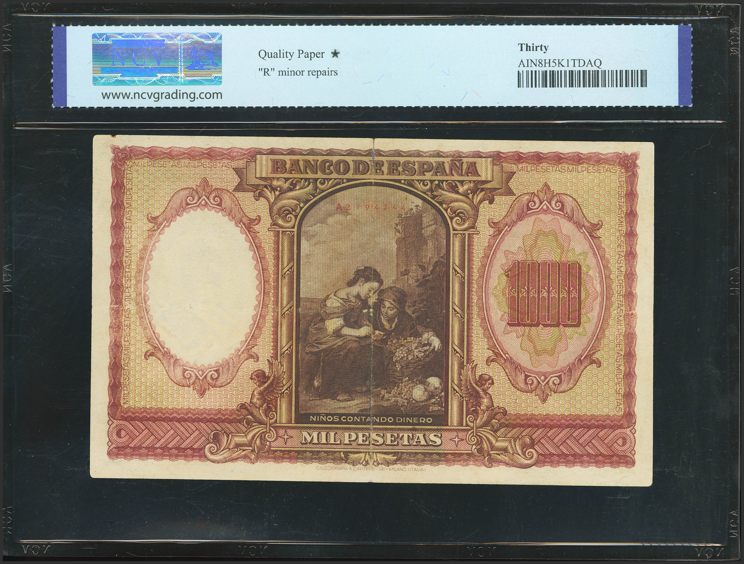 1000 Pesetas. January 9, 1940. Series A. (Edifil 2023: 440, Pick: 120a). Minor repairs. Very Fine. NCV30 encapsulation (minor repairs).