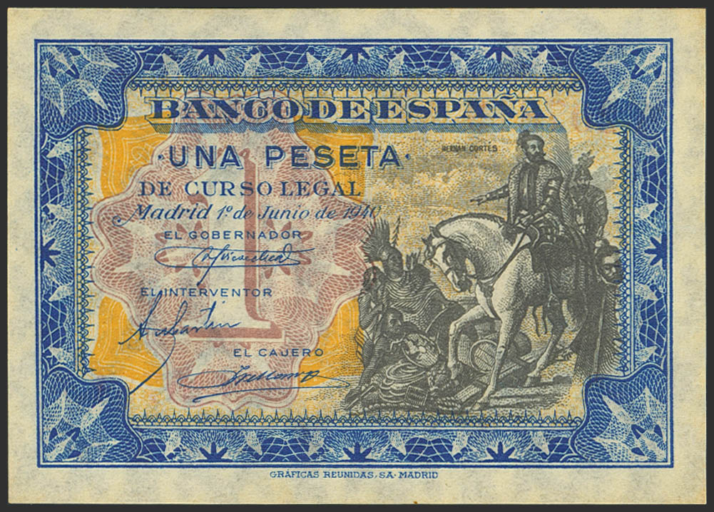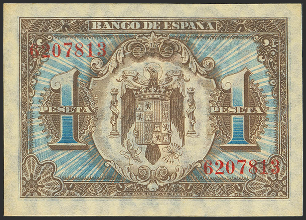 English 1 Peseta. June 1, 1940. No series. (Edifil 2023: 441). Original finish, toned. Uncirculated-.