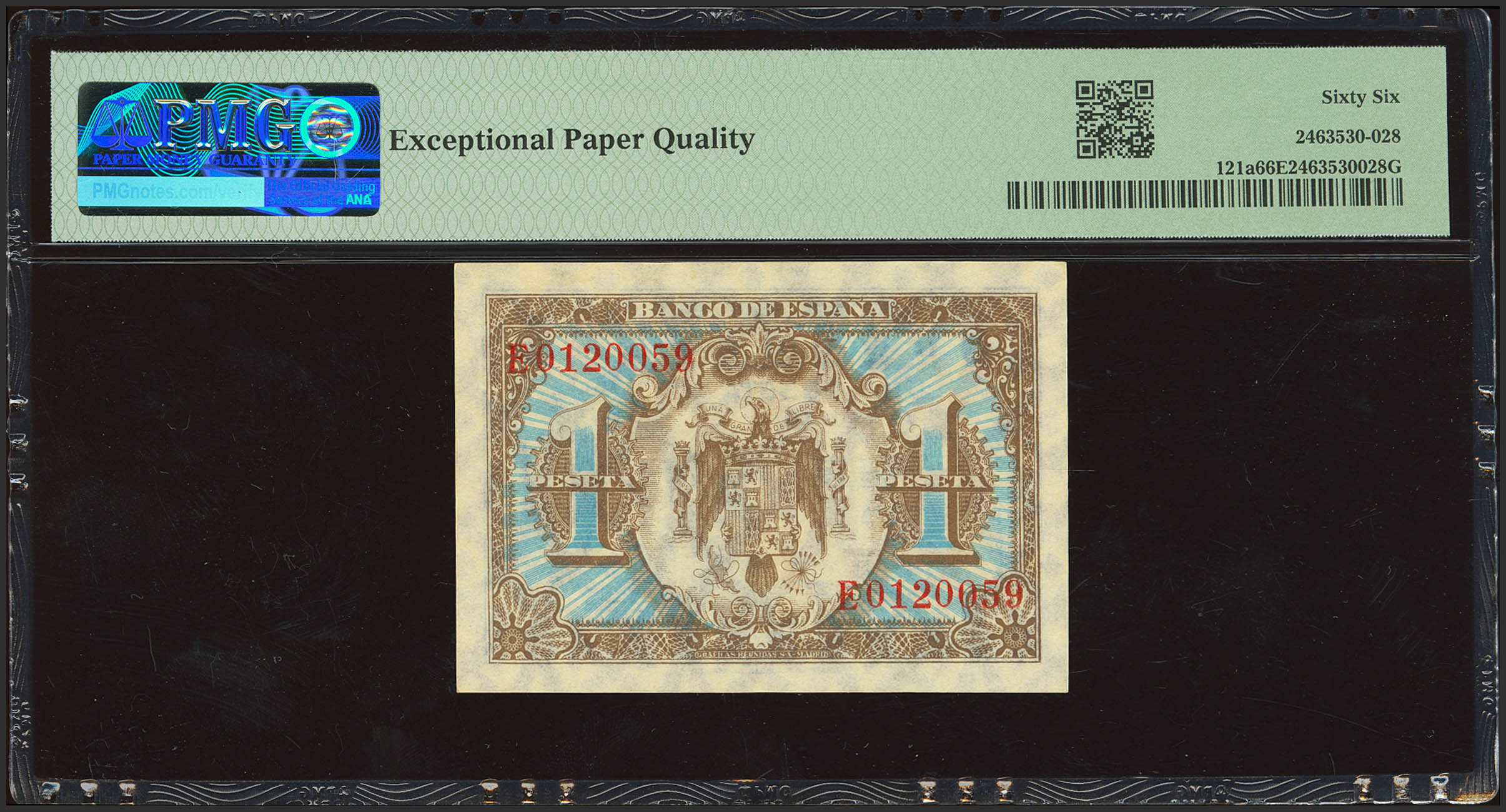 English 1 Peseta. June 1, 1940. Series E, last series issued. (Edifil 2023: 441b, Pick: 121a). Rare in this exceptional condition, original finish. Uncirculated. PMG66EPQ capsule.