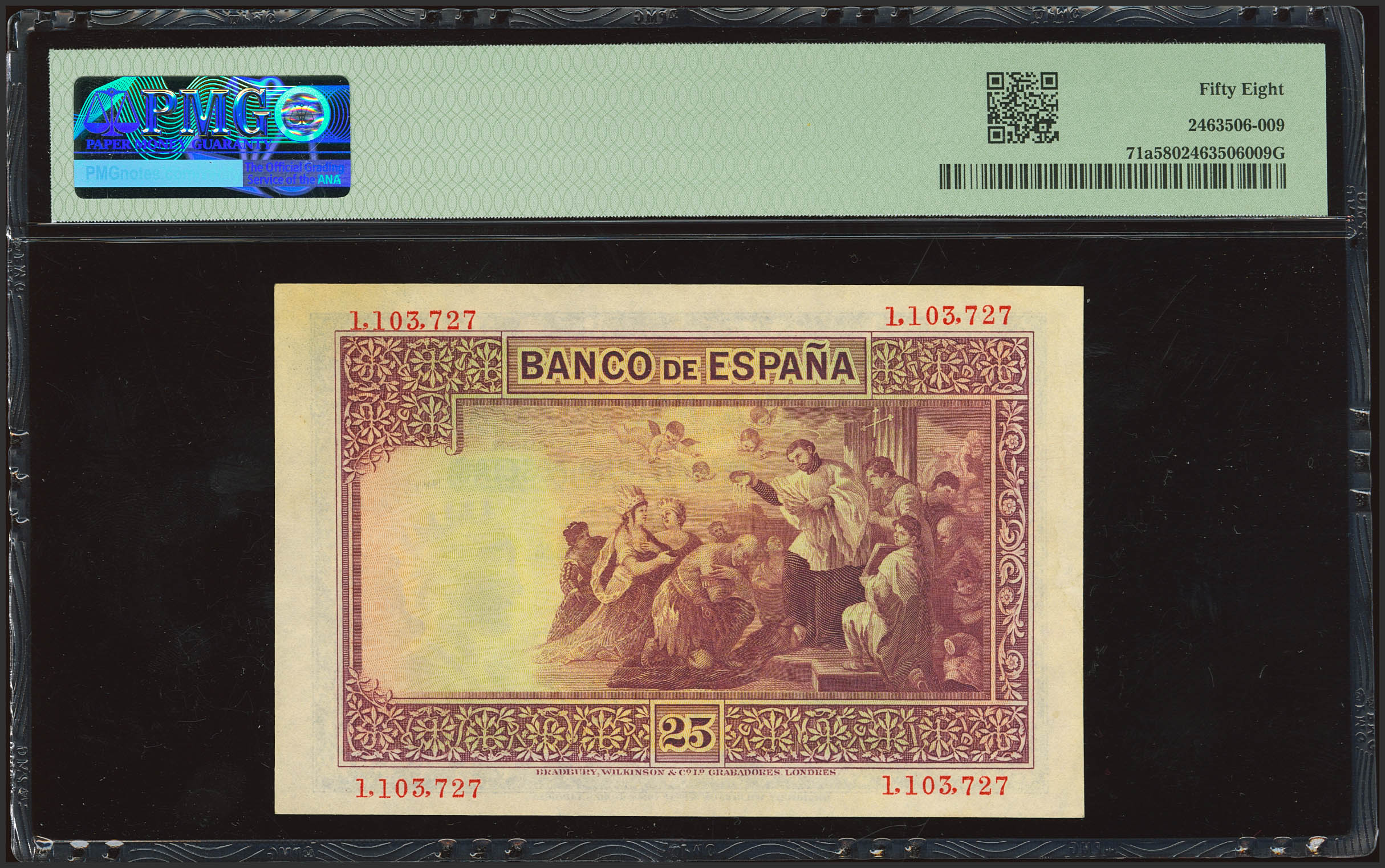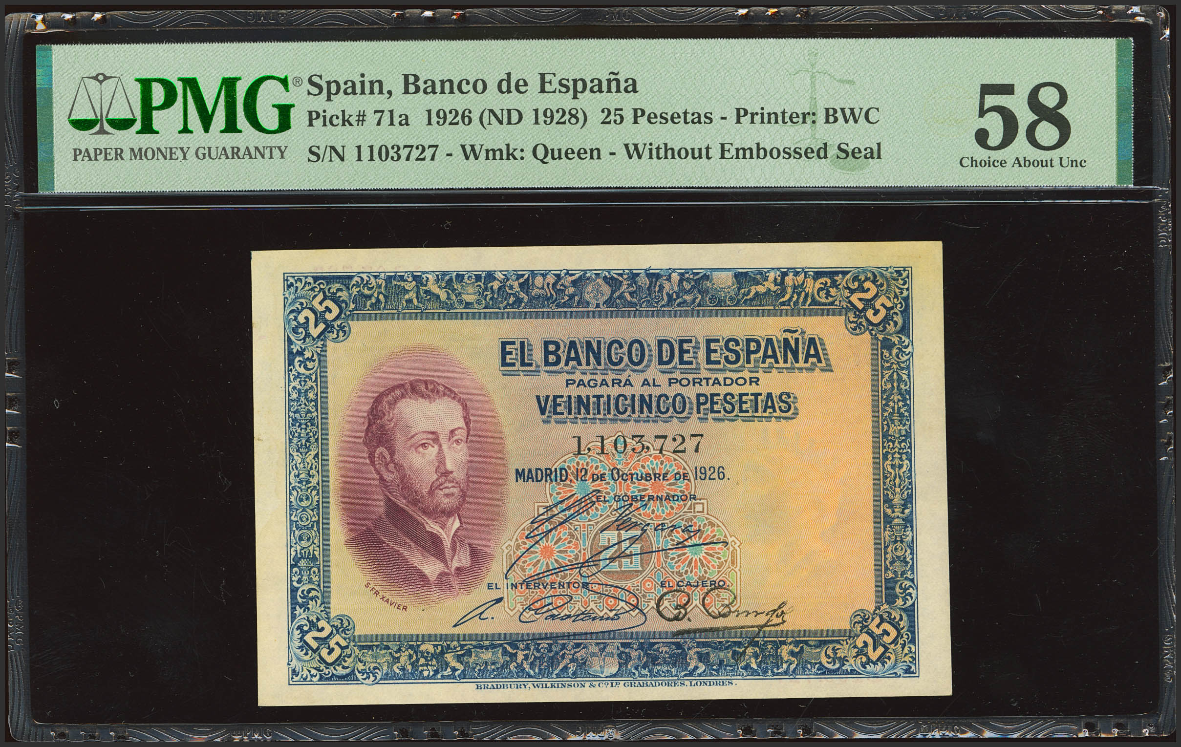 25 Pesetas. October 12, 1926. No serial number. (Edifil 2023: 325, Pick: 71a). Rare. EF++. PMG58 package.