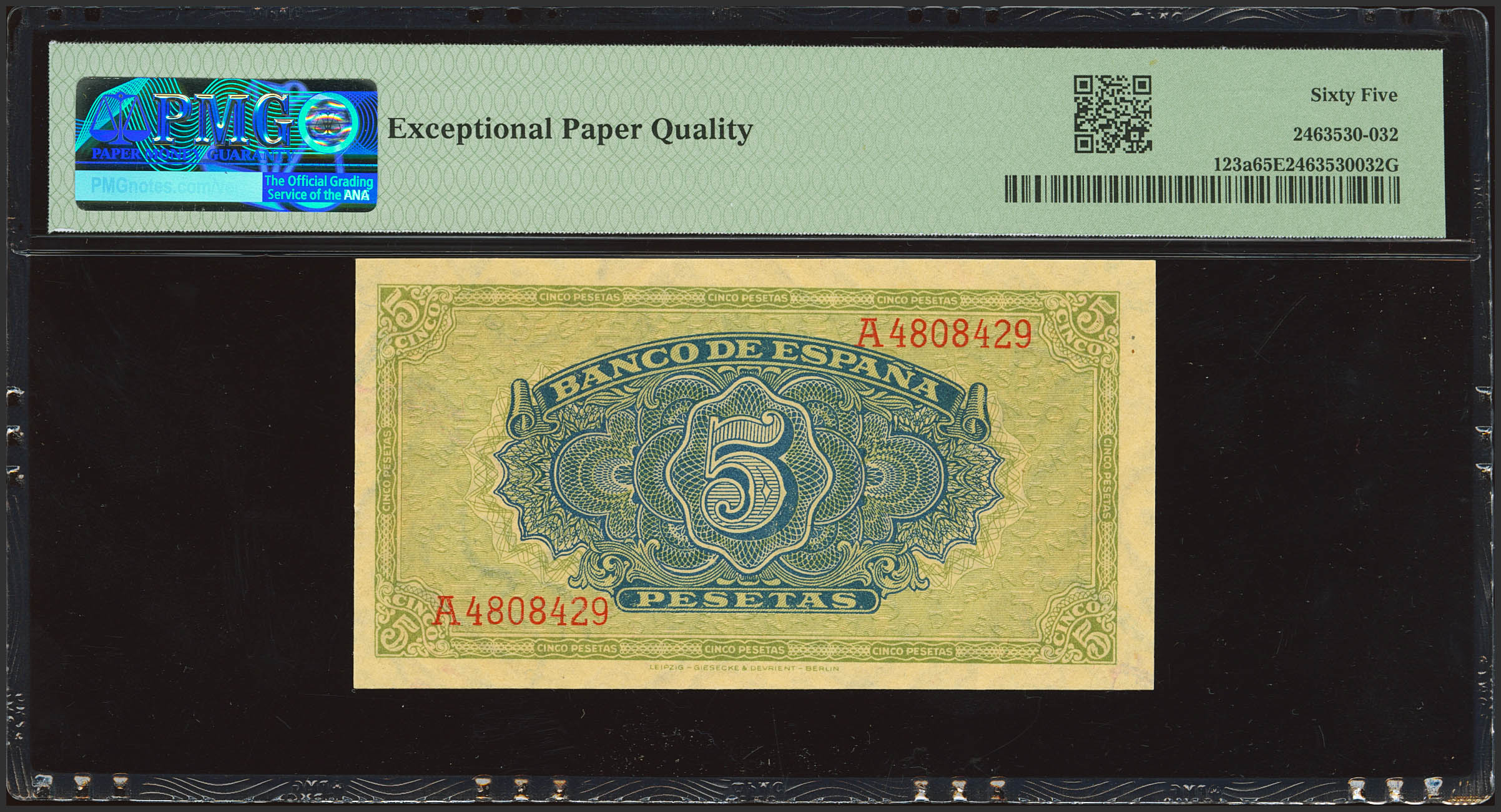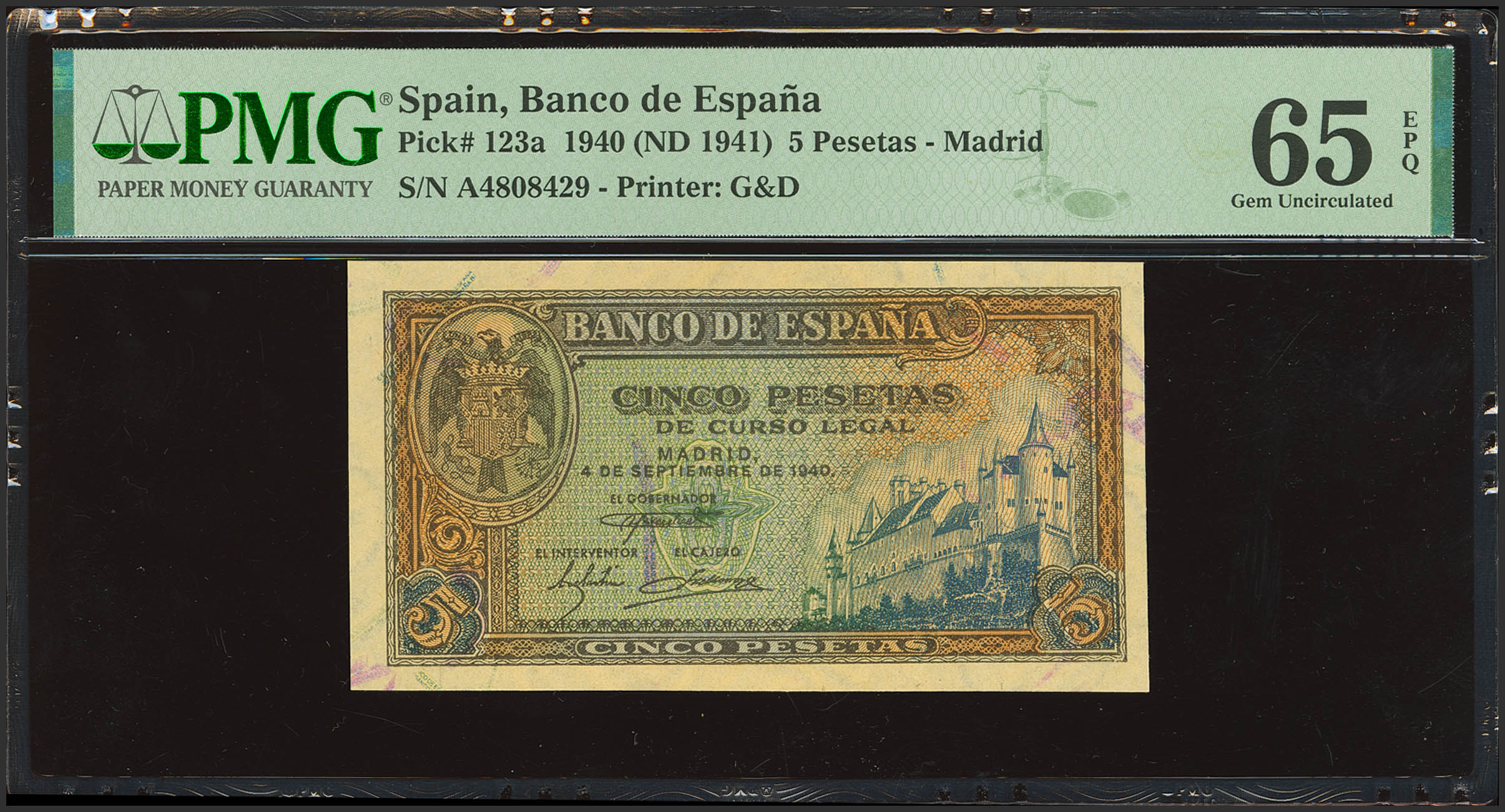 English 5 Pesetas. September 4, 1940. Series A. (Edifil 2021: 443, Pick: 123a). Rare in this exceptional condition, original finish. Uncirculated. Encapsulated PMG65EPQ.