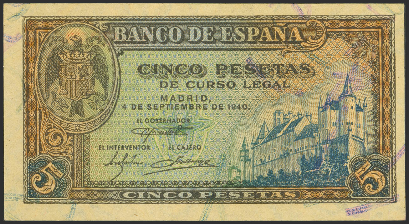 5 Pesetas. September 4, 1940. Series A. (Edifil 2023: 443). Rare in this condition, original finish. Uncirculated.