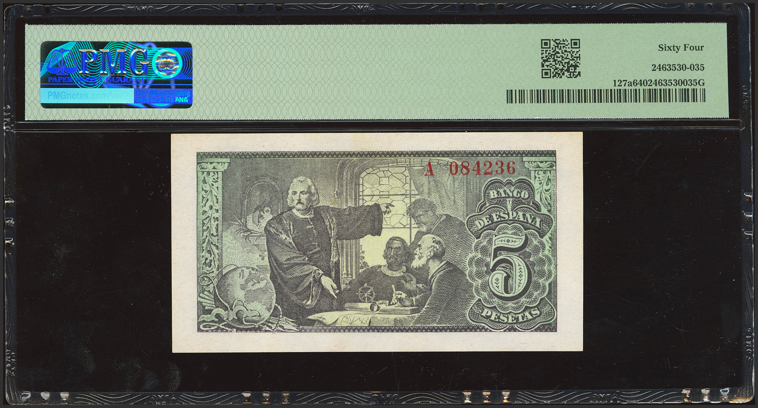 English 5 Pesetas. February 13, 1943. Series A. (Edifil 2023: 446a, Pick: 127a). Uncirculated. PMG64 encapsulated.