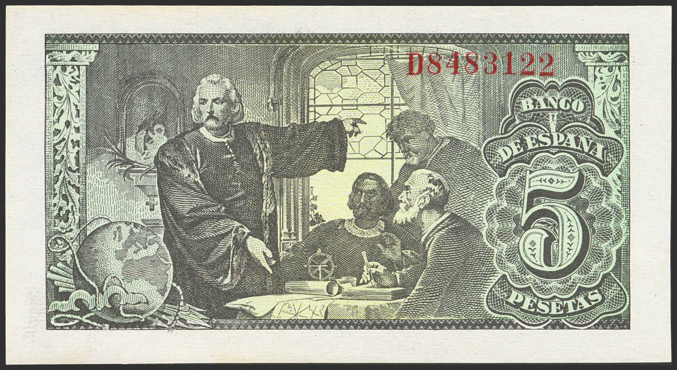 English 5 Pesetas. February 13, 1943. Series D. (Edifil 2023: 446a). Original finish. Uncirculated-.