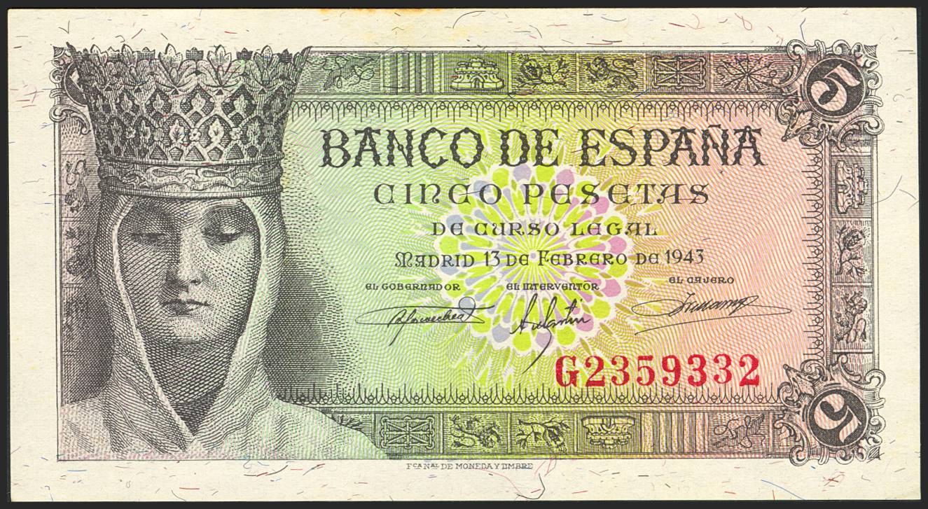 5 Pesetas. February 13, 1943. Series G. (Edifil 2023: 446a). Original finish, some age-related wear. EF+.