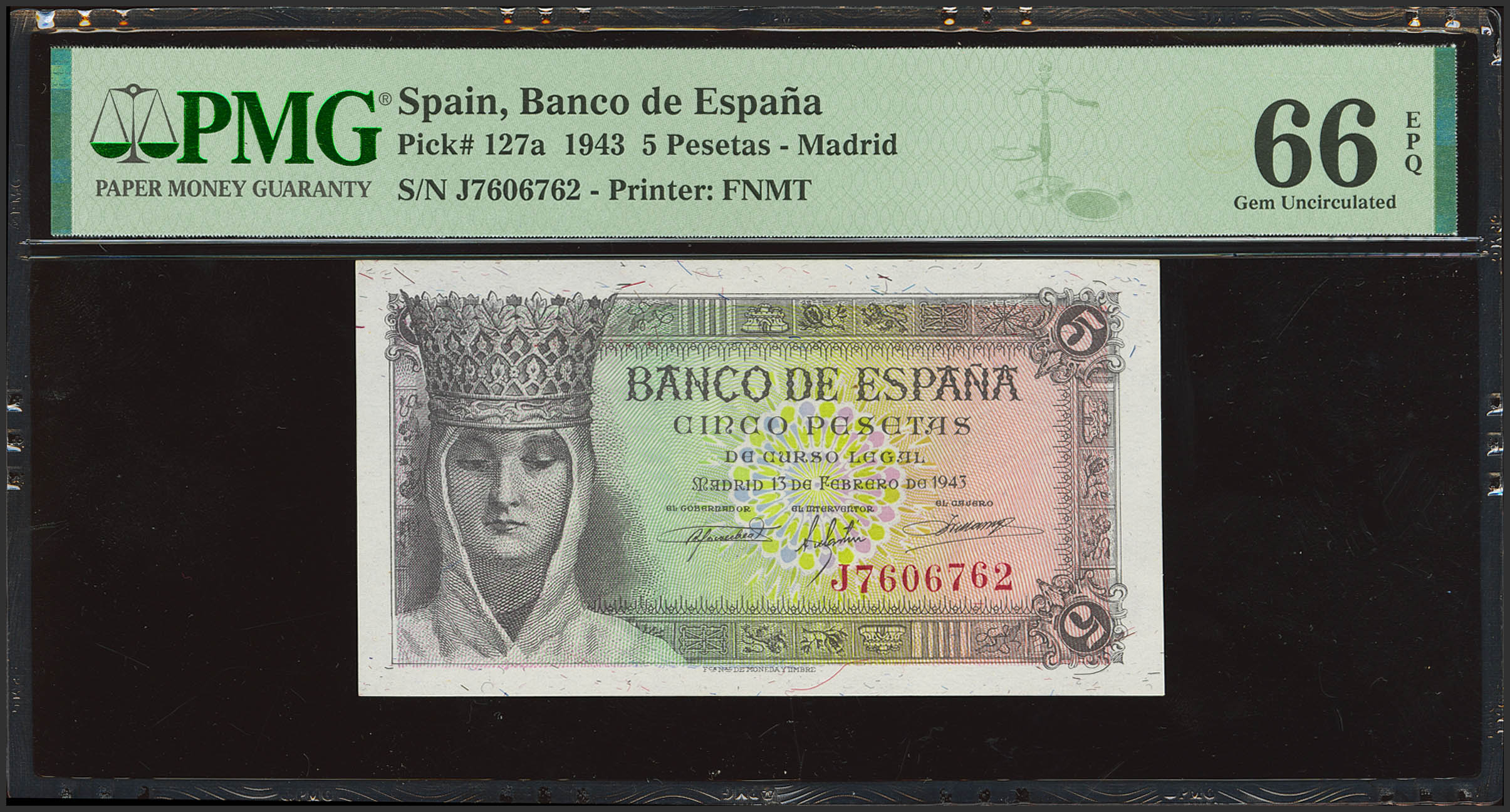 5 Pesetas. February 13, 1943. Series J, last series issued. (Edifil 2023: 446b, Pick: 127a). Original finish. Uncirculated. PMG66EPQ capsule.