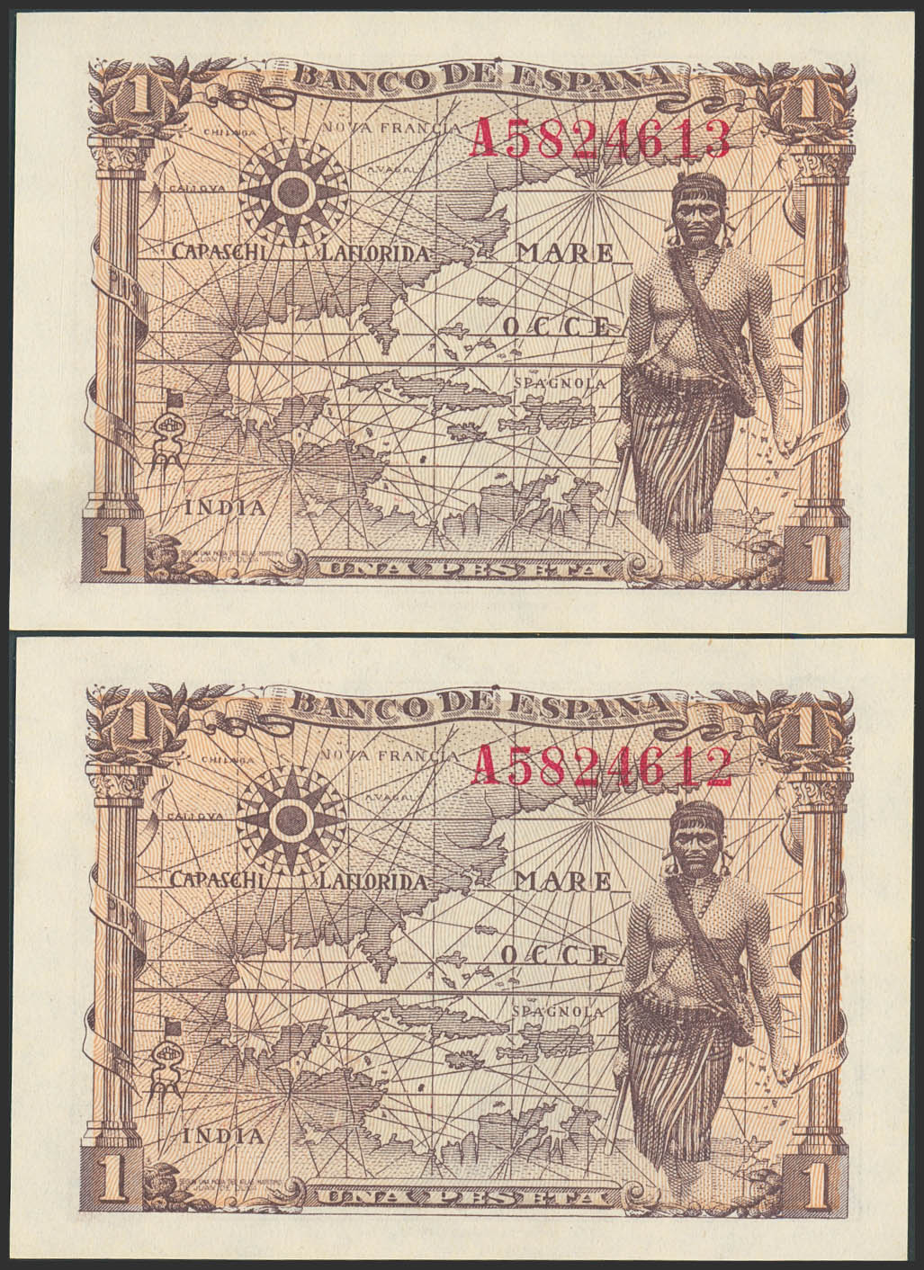 English 1 Peseta. June 15, 1945. Consecutive pair. Series A. (Edifil 2023: 448a). Original finish. Uncirculated.