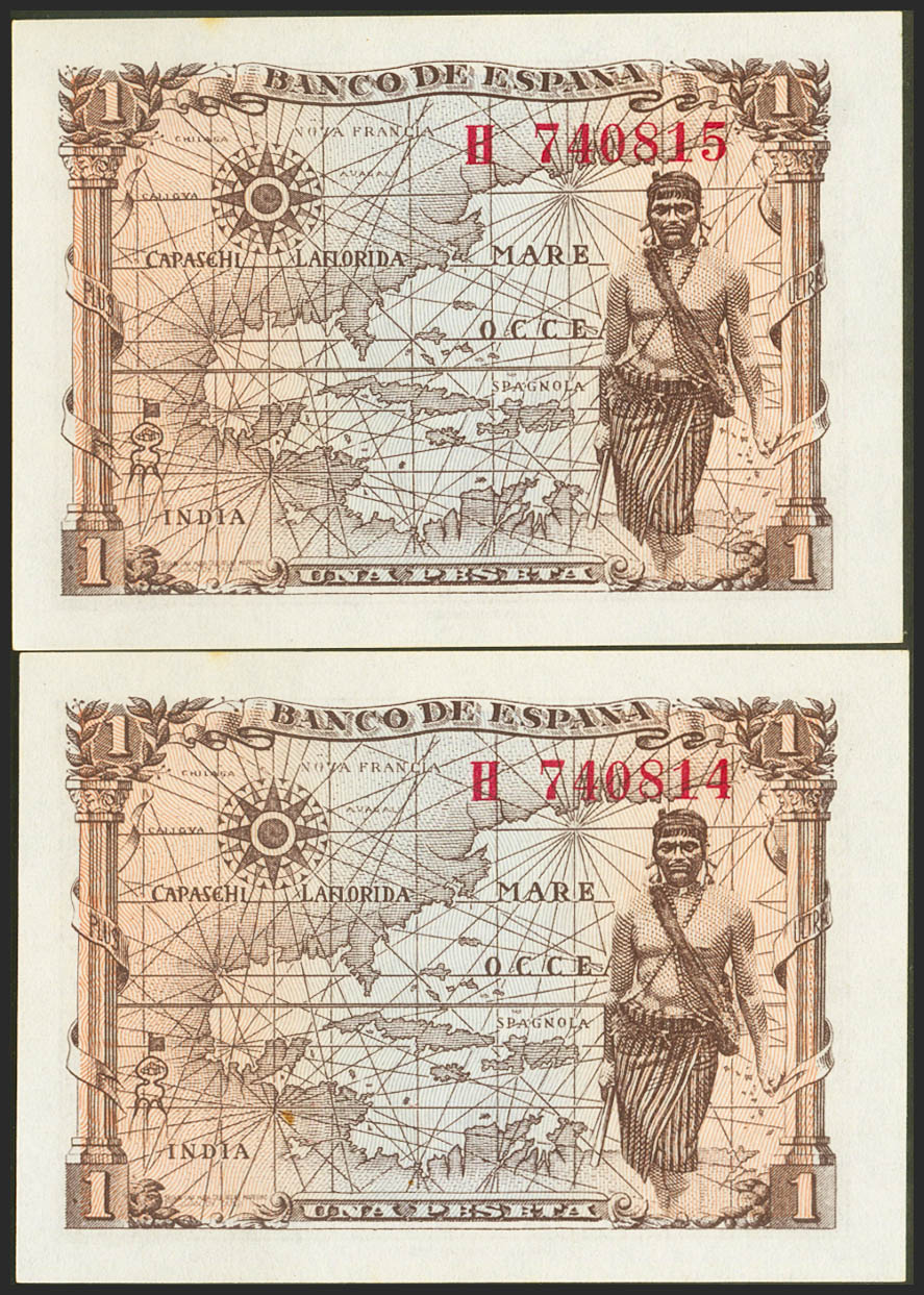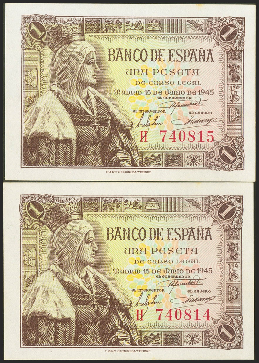 1 Peseta. June 15, 1945. Consecutive pair. Series H. (Edifil 2021: 448a). Original finish, dot. Uncirculated-.