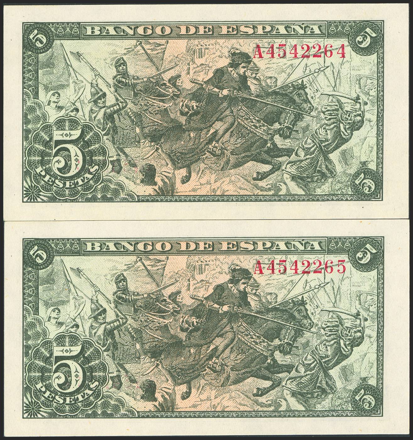 English 5 Pesetas. June 15, 1945. Consecutive pair. Series A. (Edifil 2023: 449a). Original finish. Uncirculated.
