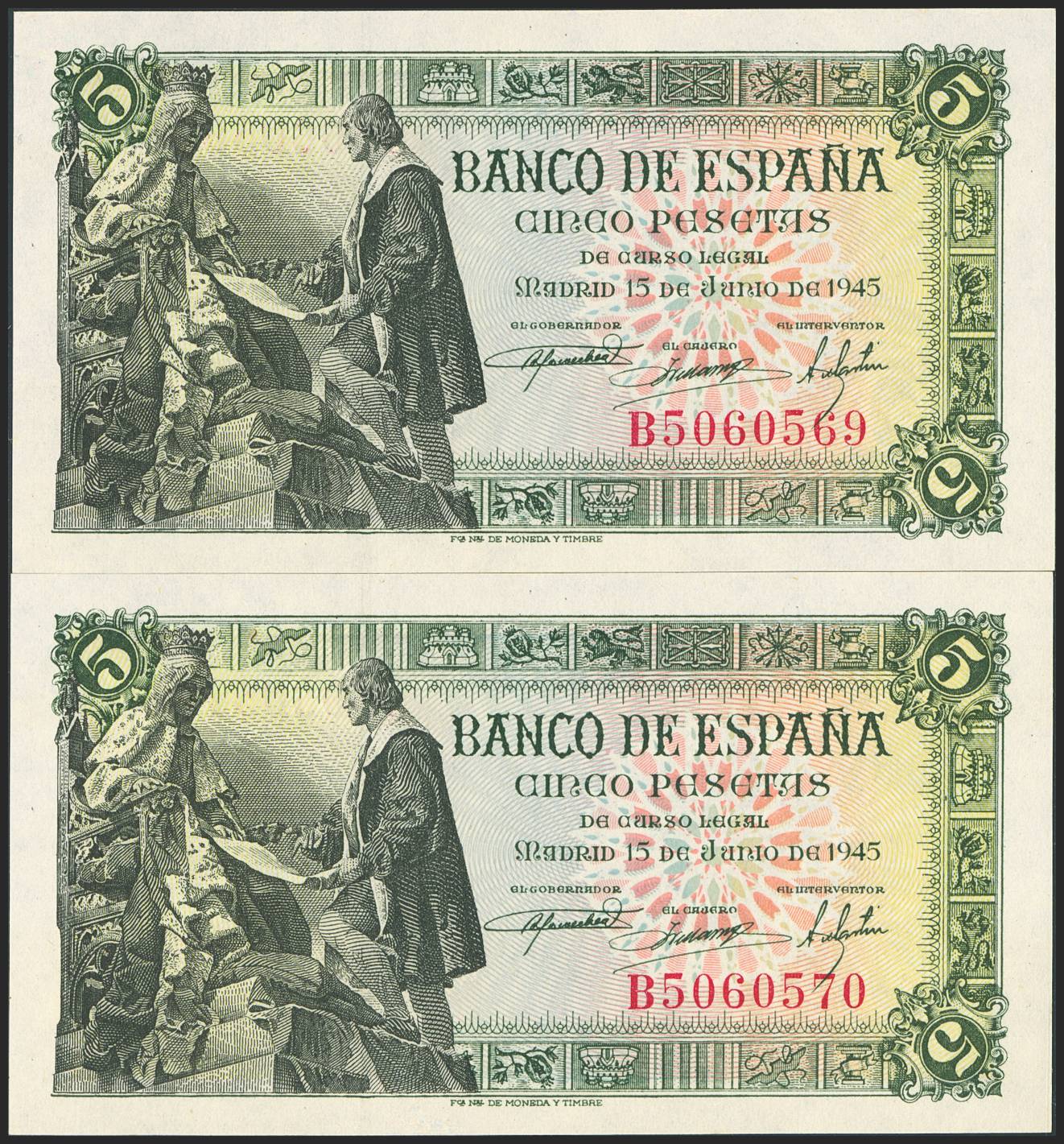 English 5 Pesetas. June 15, 1945. Consecutive pair. Series B. (Edifil 2023: 449a). Original finish. Uncirculated.