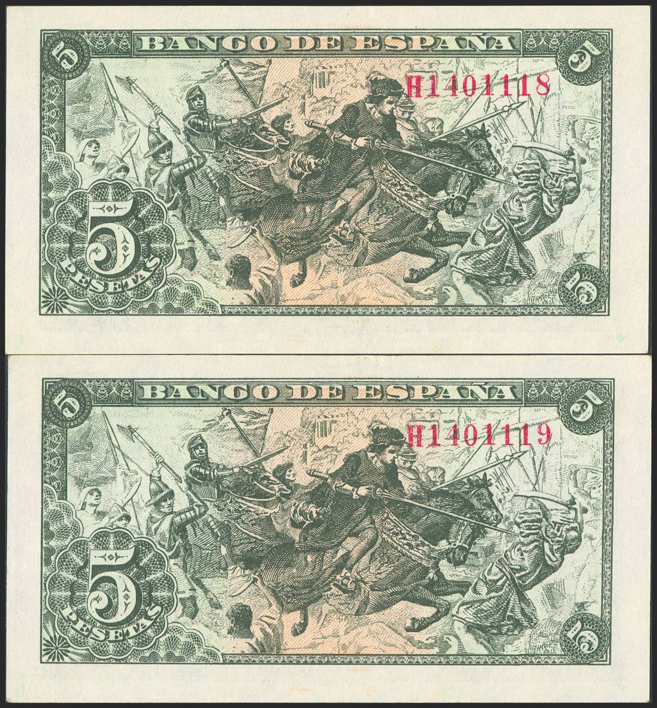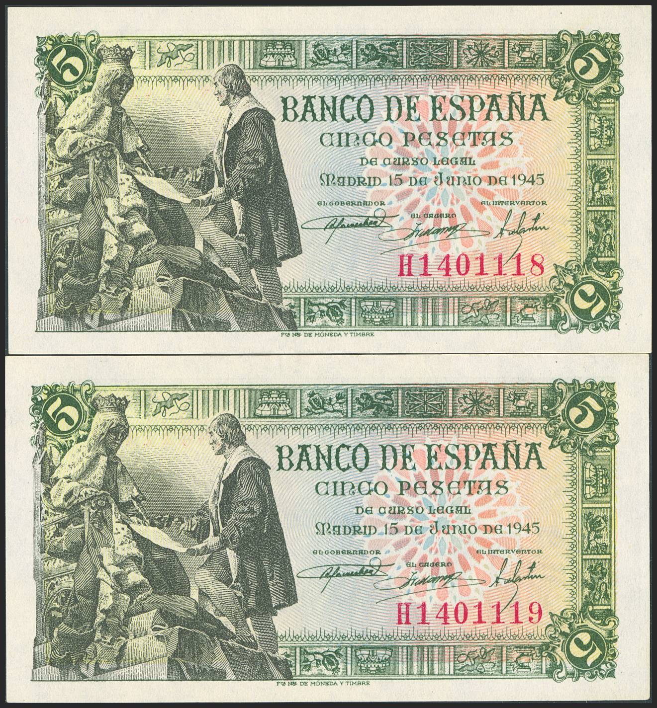 5 Pesetas. June 15, 1945. Consecutive pair. Series H. (Edifil 2023: 449a). Original finish. Uncirculated-.