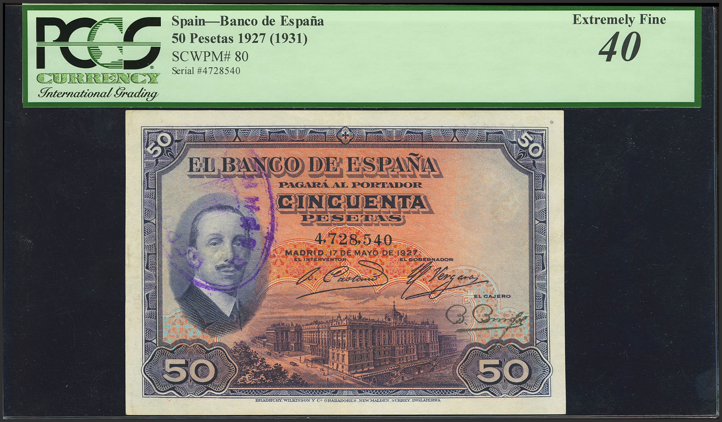 50 Pesetas. May 17, 1931. No serial number and rubber stamp REPUBLICA / ESPAÑOLA. (Edifil 2023: 332, Pick: 80b). EF-. Encapsulated PCGS40.