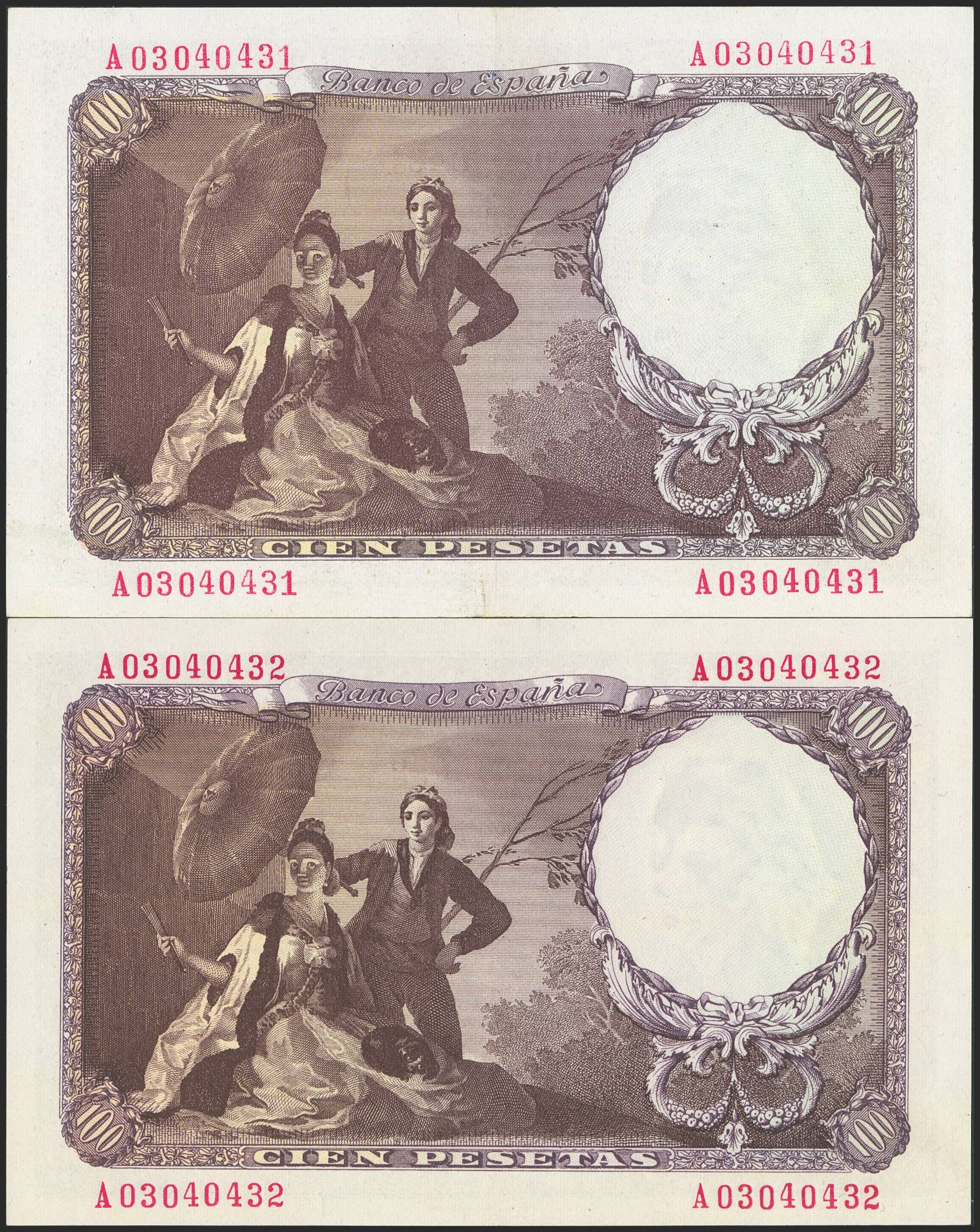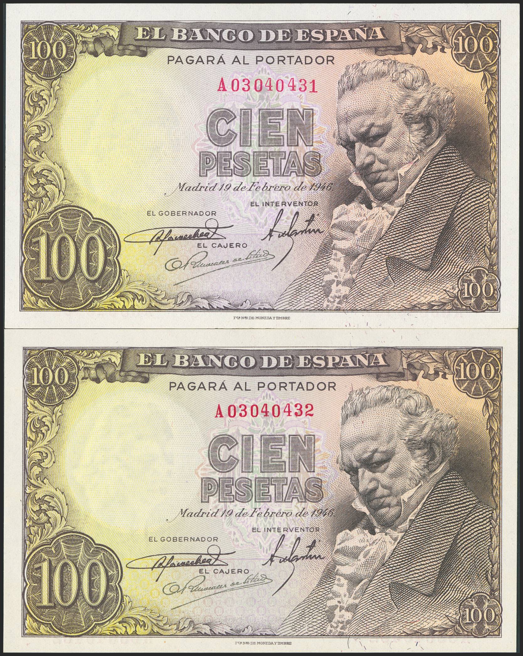 100 Pesetas. February 19, 1946. Consecutive pair. Series A. (Edifil 2023: 451a). Retains much of its original finish. EF+.