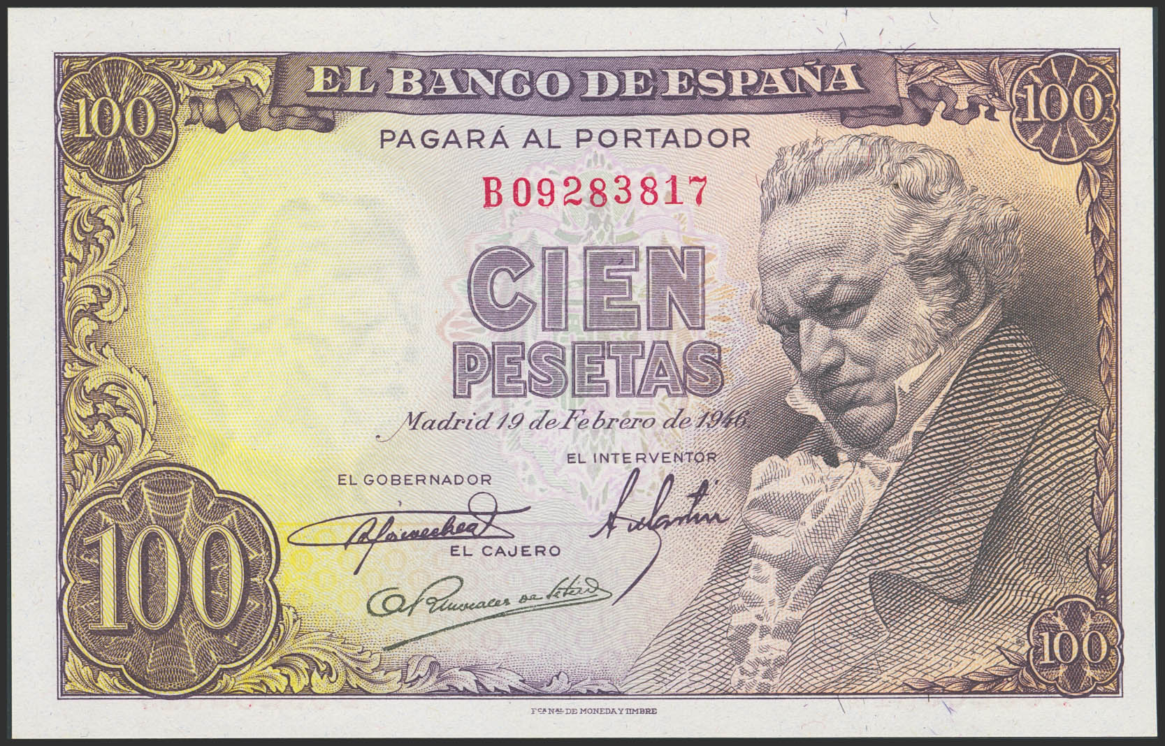 100 Pesetas. February 19, 1946. Series B. (Edifil 2023: 451b). Original condition. Uncirculated.