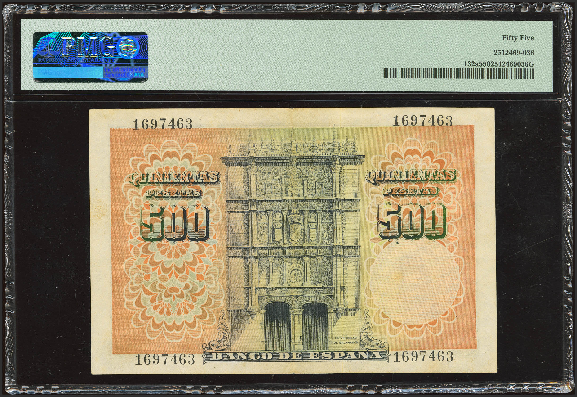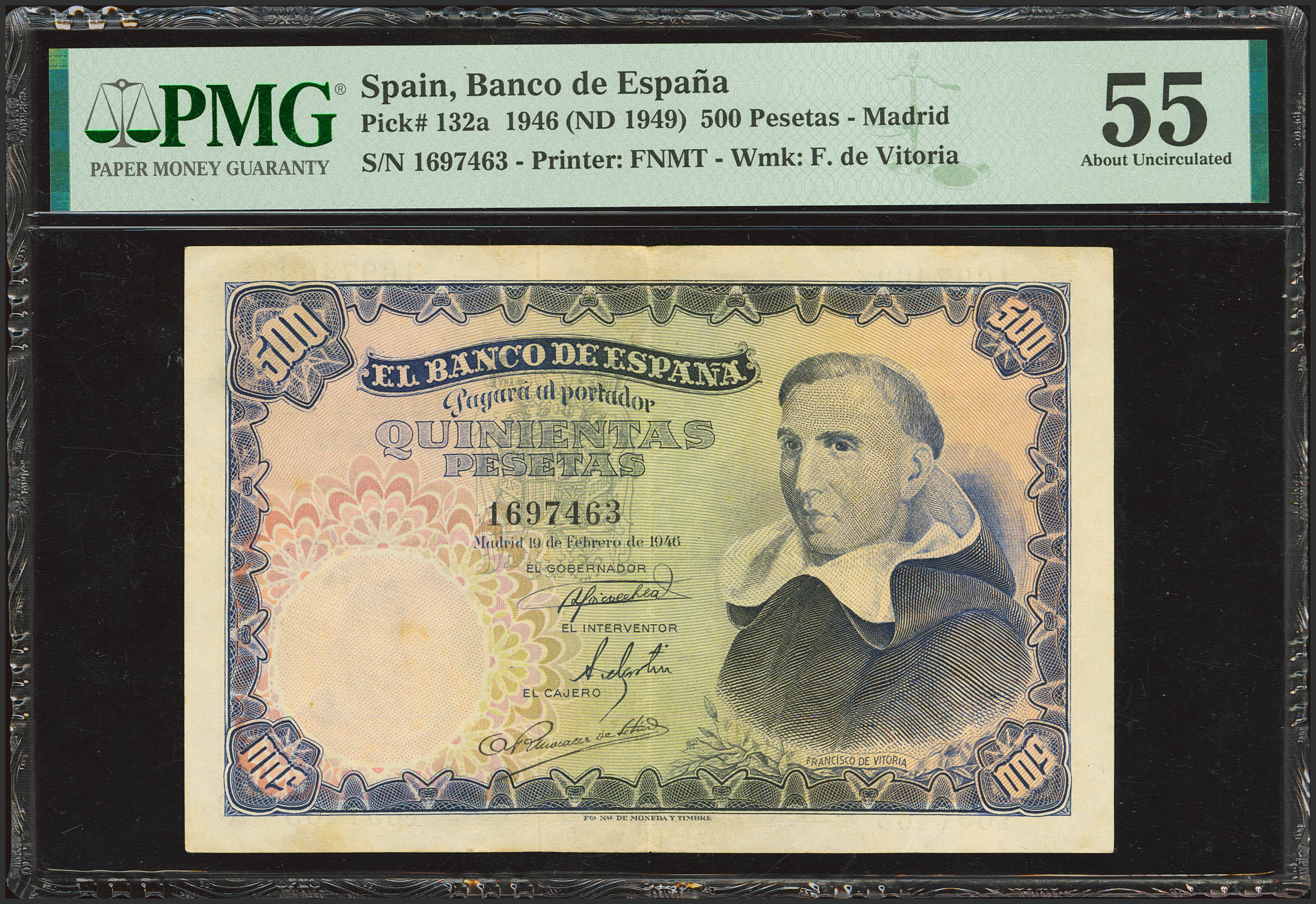 500 Pesetas. February 19, 1948. No serial number. (Edifil 2023: 452, Pick: 132a). EF+. PMG55 package.