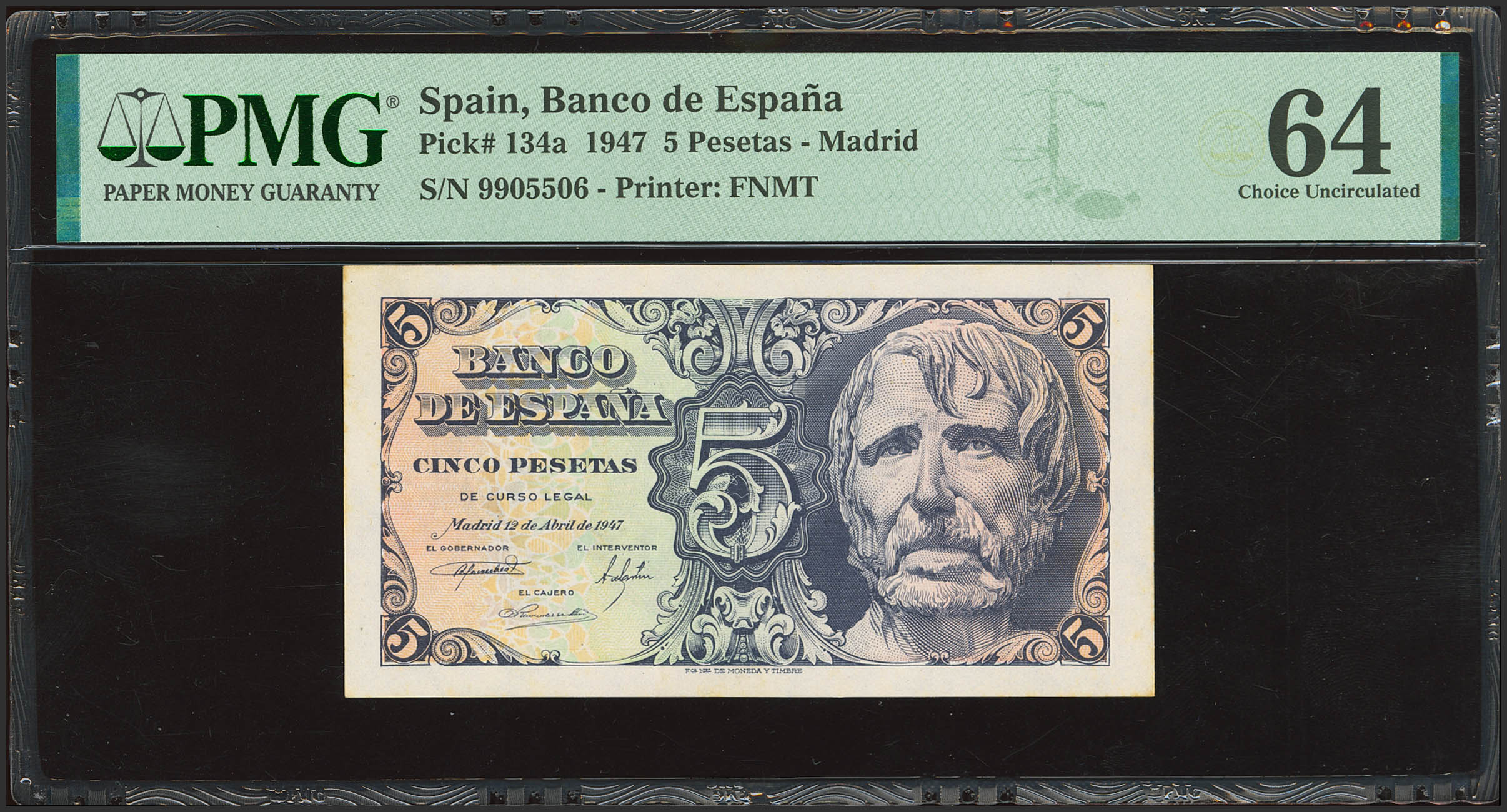 English 5 Pesetas. April 12, 1947. No serial number. (Edifil 2023: 454, Pick: 134a). Uncirculated. PMG64 encapsulated.