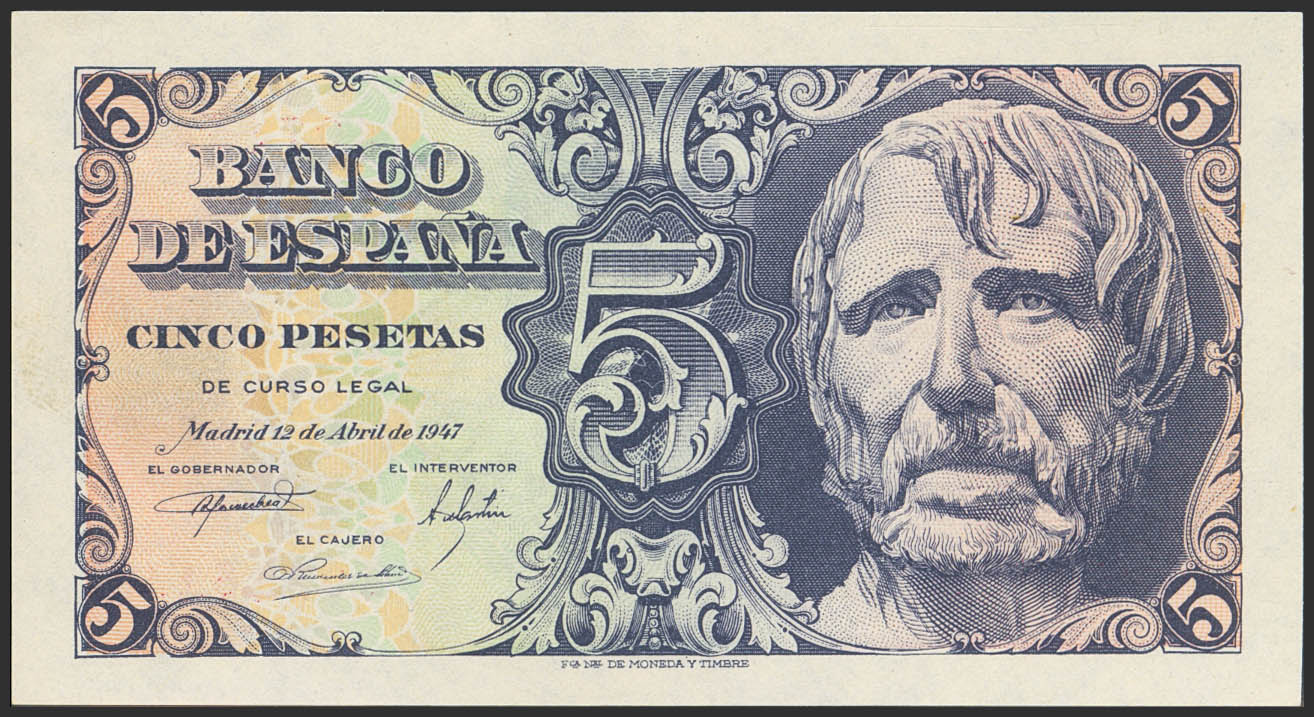 5 Pesetas. April 12, 1947. No series. (Edifil 2023: 454). Retains much of its original finish. EF+++.