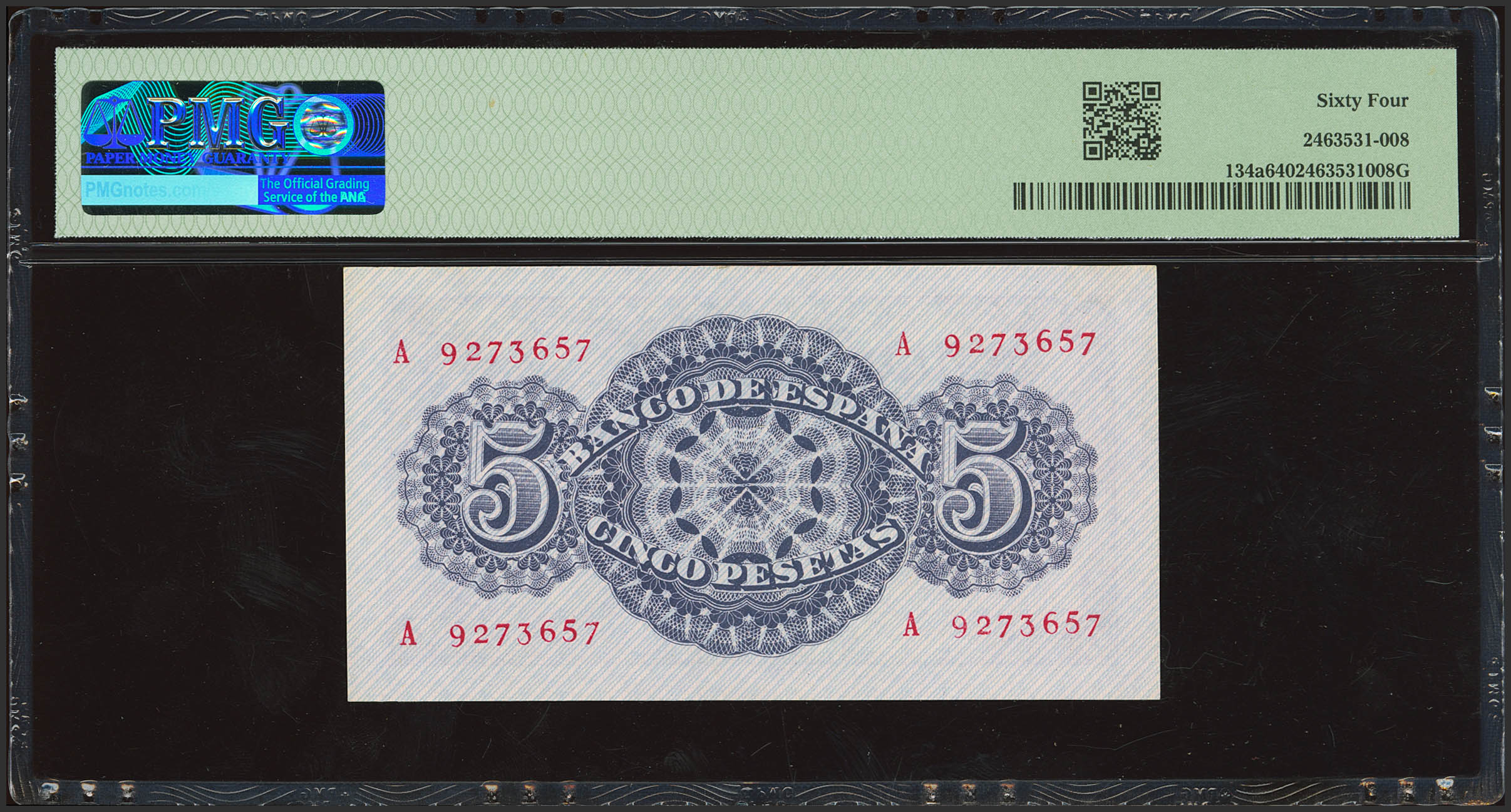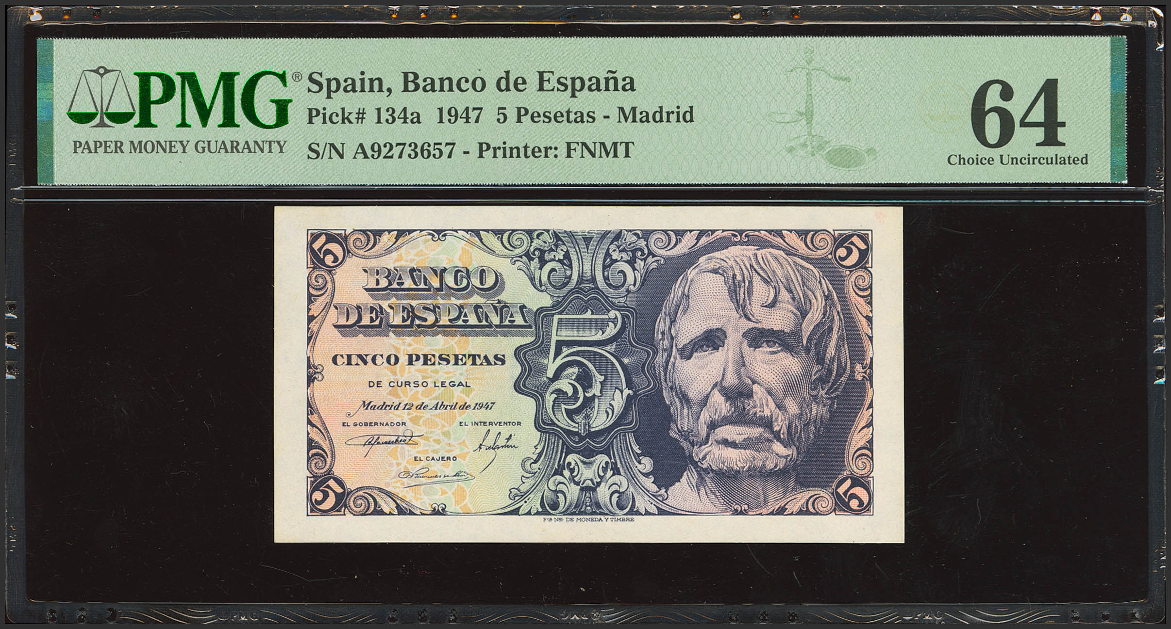 5 Pesetas. April 12, 1947. Series A. (Edifil 2023: 454a, Pick: 134a). Uncirculated. PMG64 encapsulated.