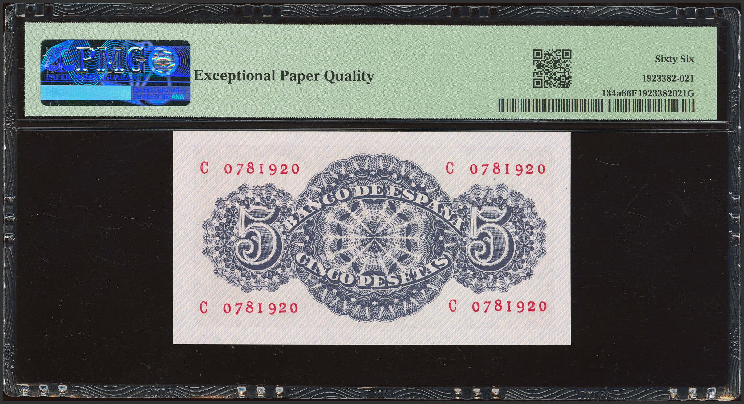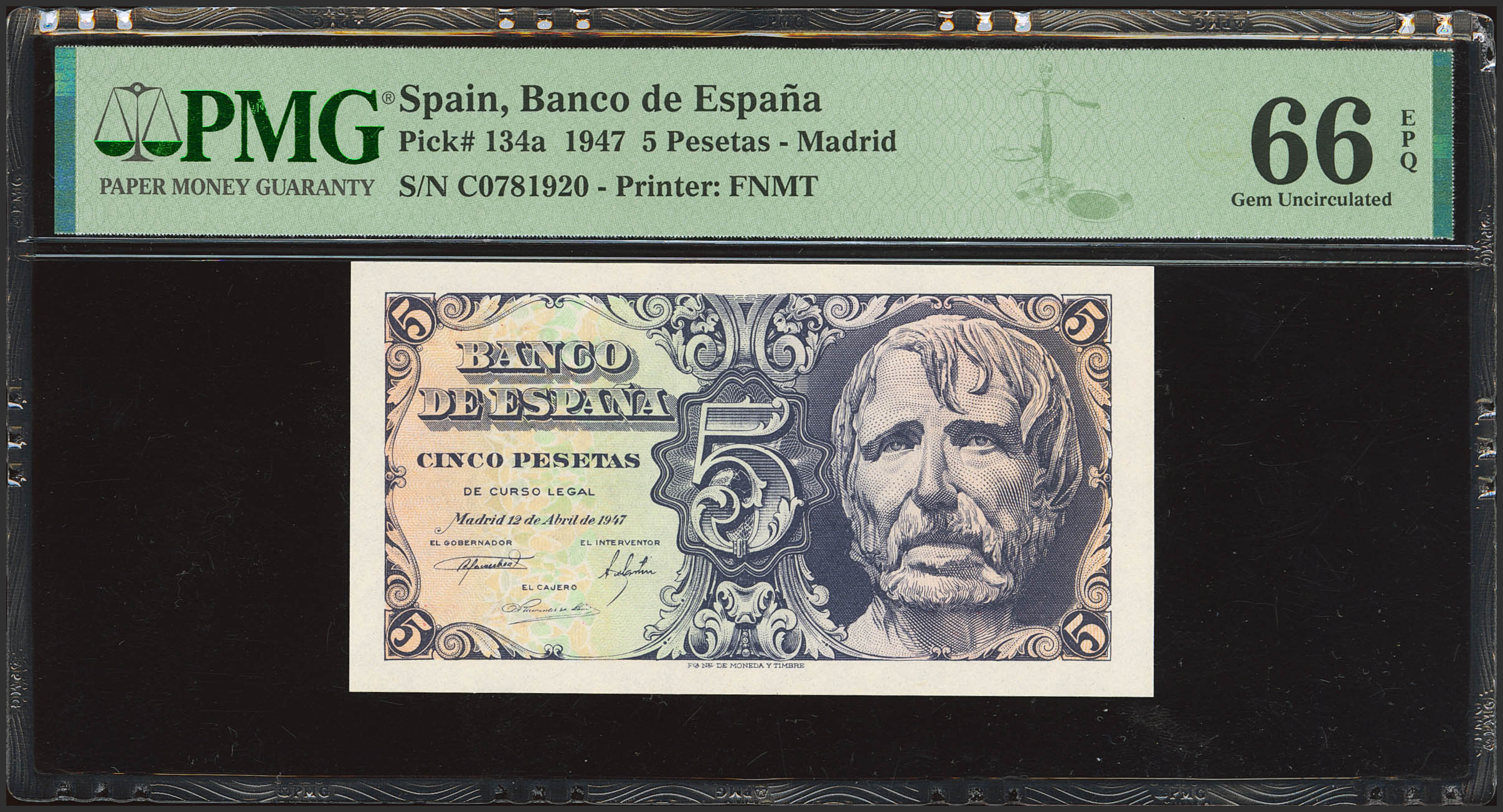 5 Pesetas. April 12, 1947. Series C. (Edifil 2023: 454a, Pick: 134a). Original finish. Uncirculated. PMG66EPQ encapsulation.