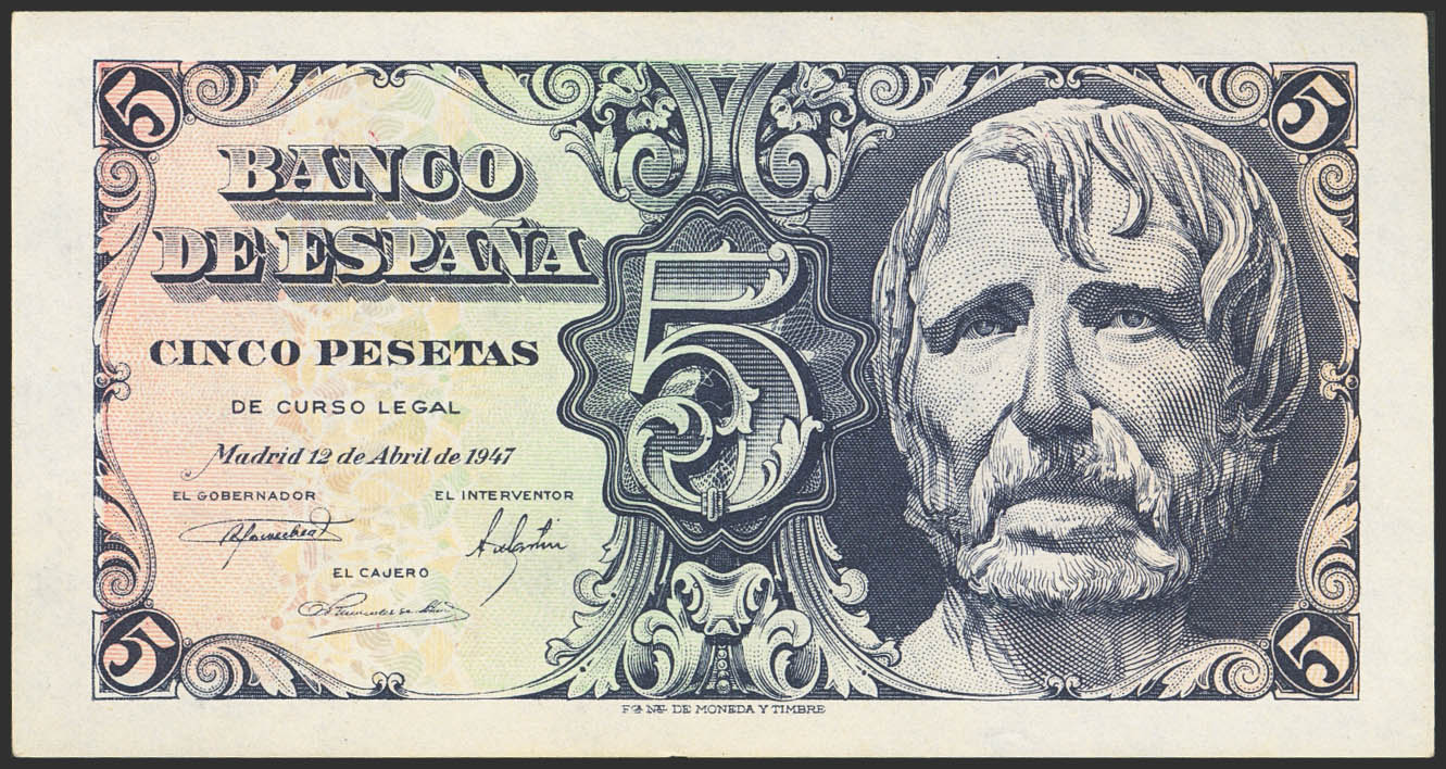 5 Pesetas. April 12, 1947. Series E, last series issued. (Edifil 2023: 454b). Original condition. UNC.
