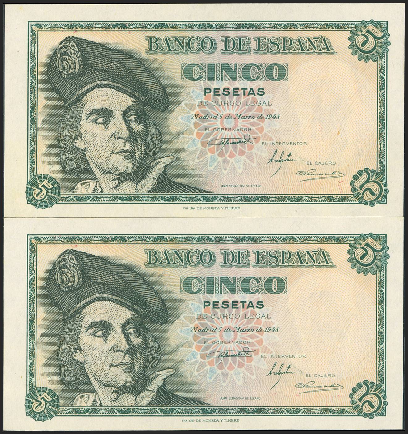5 Pesetas. March 5, 1948. Consecutive pair. Series A. (Edifil 2023: 455a). Original finish. Uncirculated.