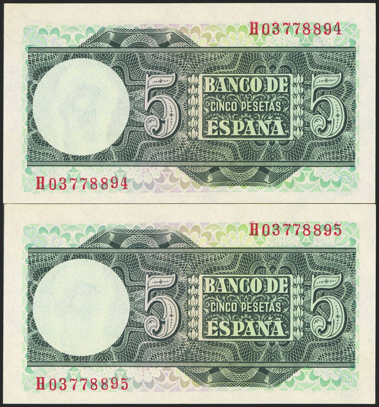 5 Pesetas. March 5, 1948. Consecutive pair. Series H. (Edifil 2023: 455a). Original finish. Uncirculated/Uncirculated-.