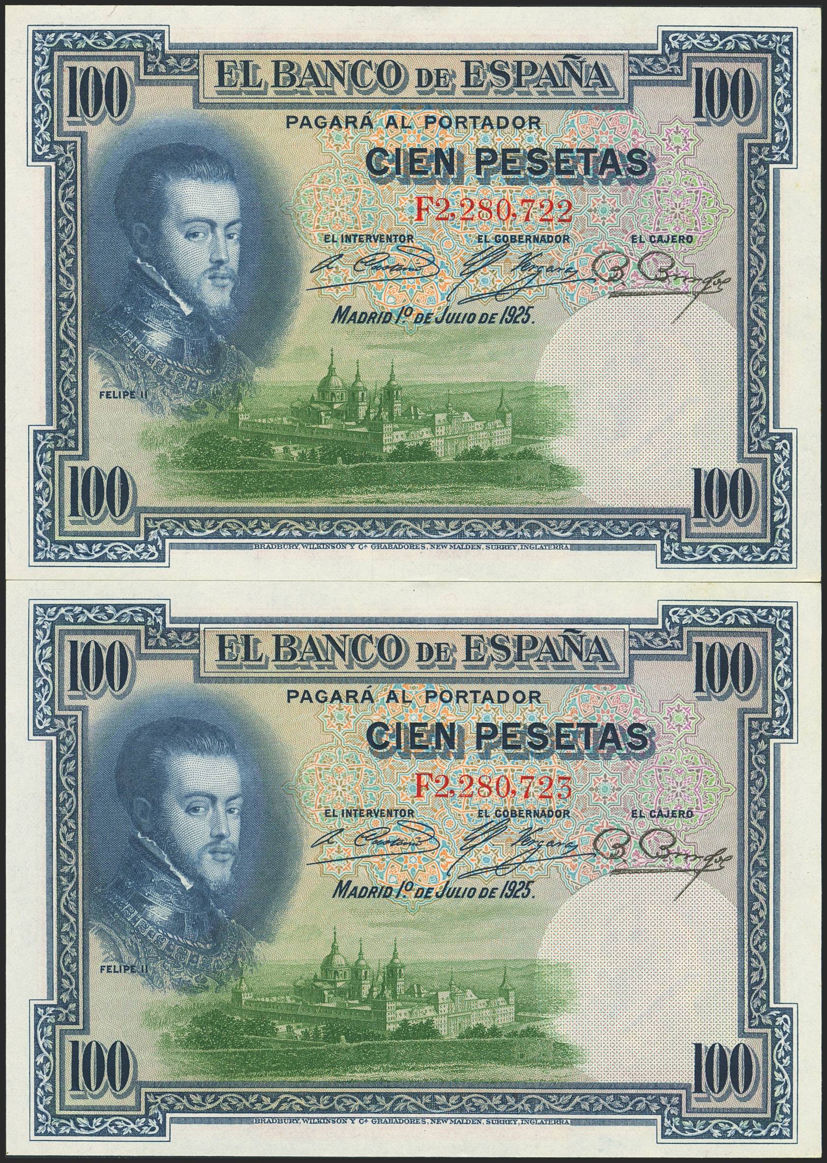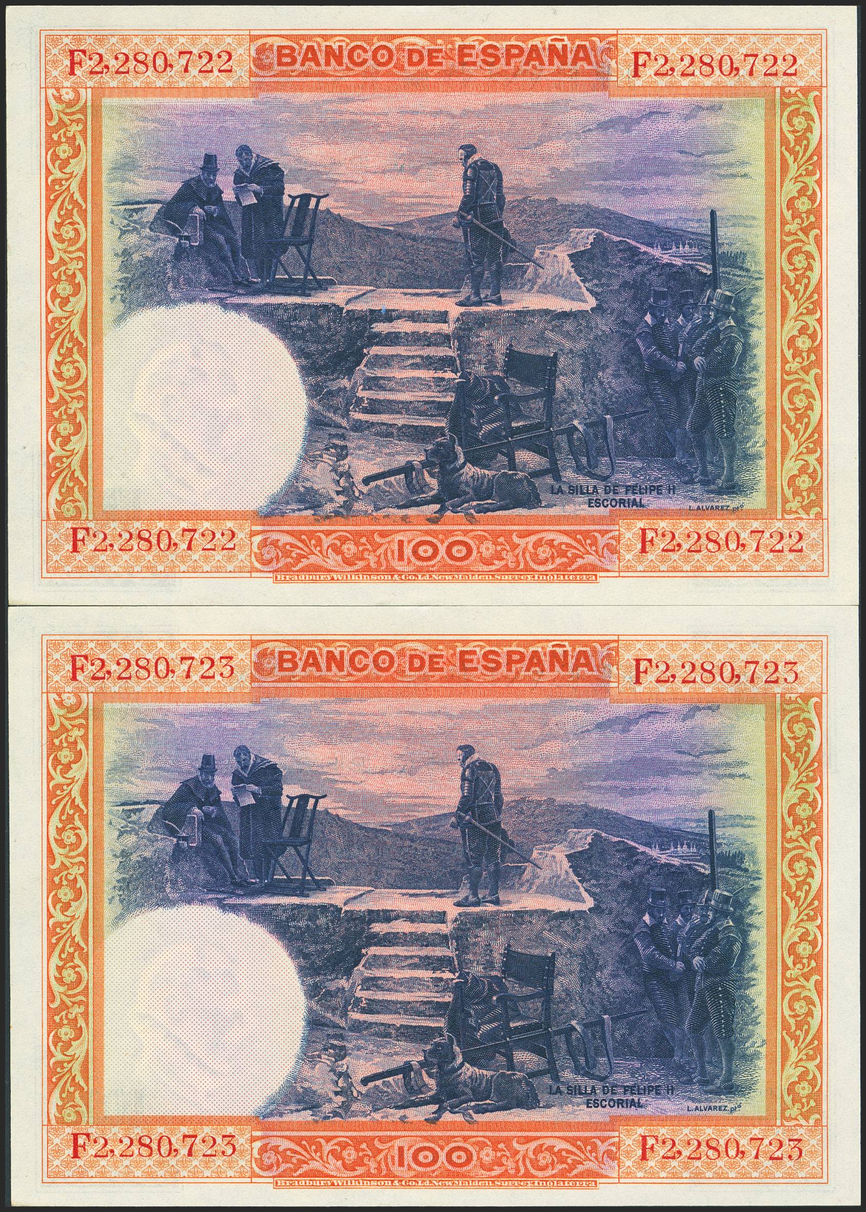 100 Pesetas. July 1, 1925. Consecutive pair. Series F. (Edifil 2023: 350). Original finish. Uncirculated.
