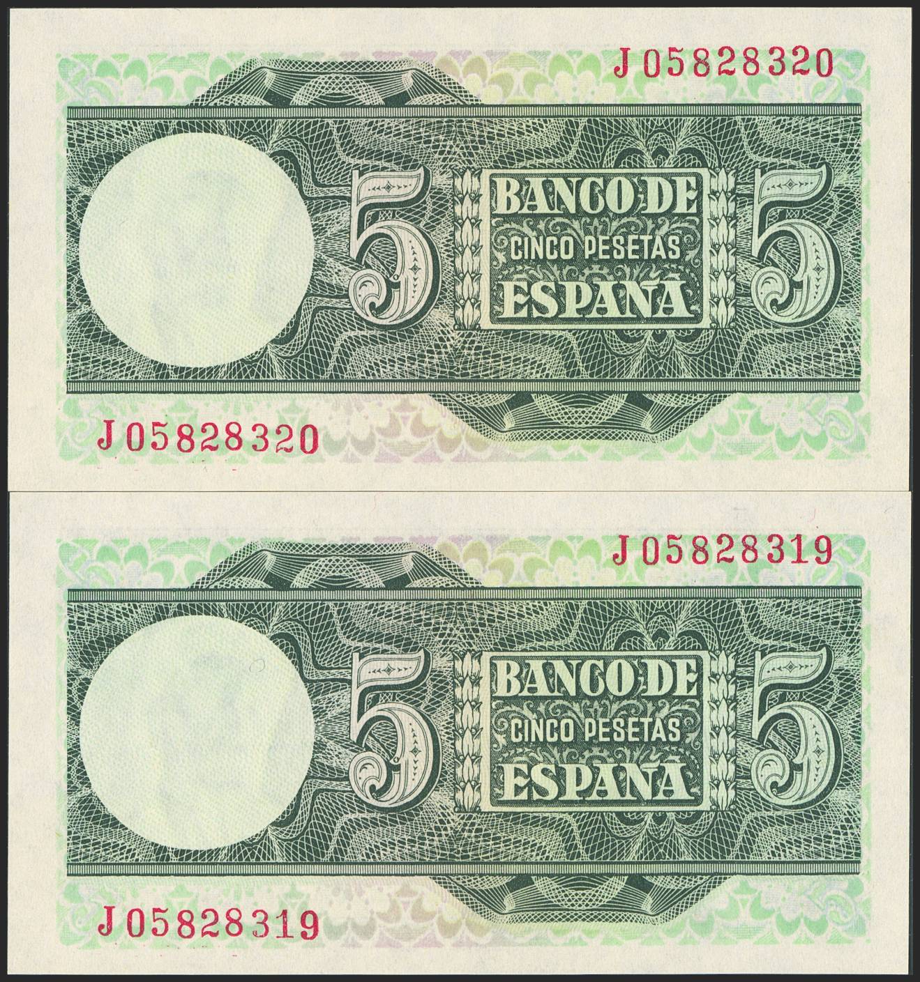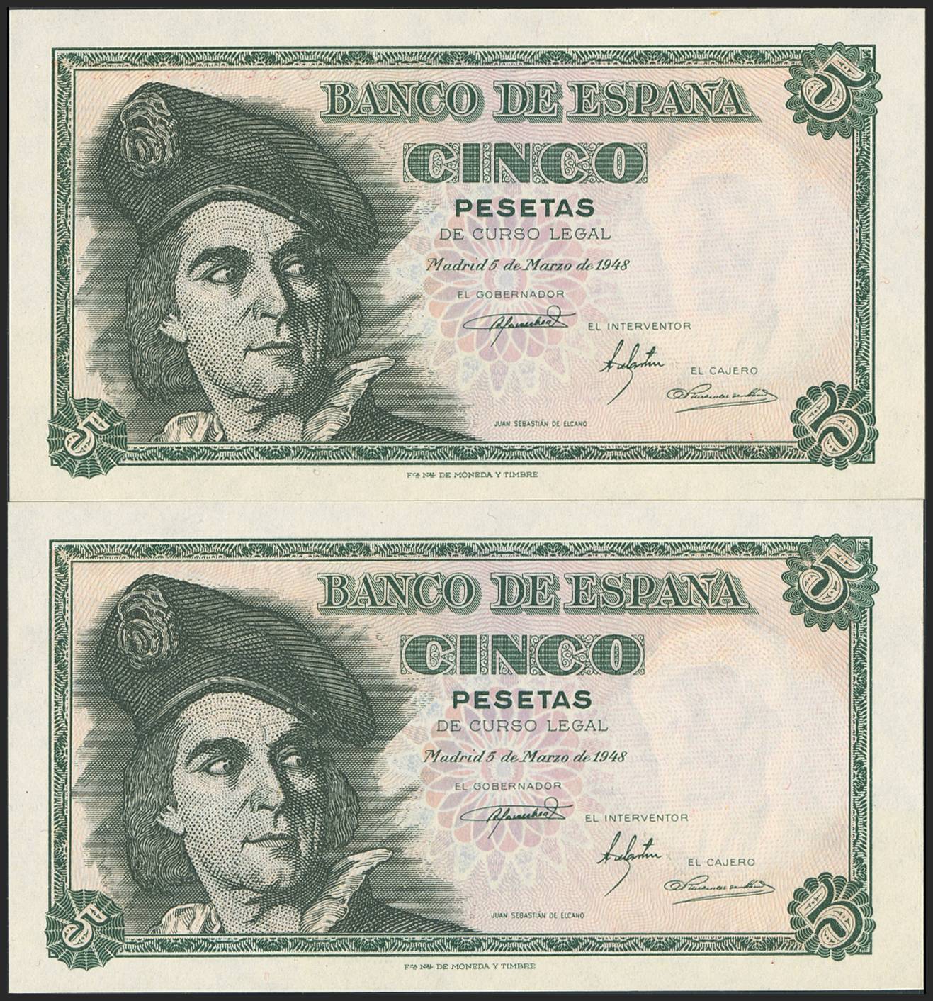 5 Pesetas. March 5, 1948. Consecutive pair. Series J. (Edifil 2023: 455a). Original finish. Uncirculated.