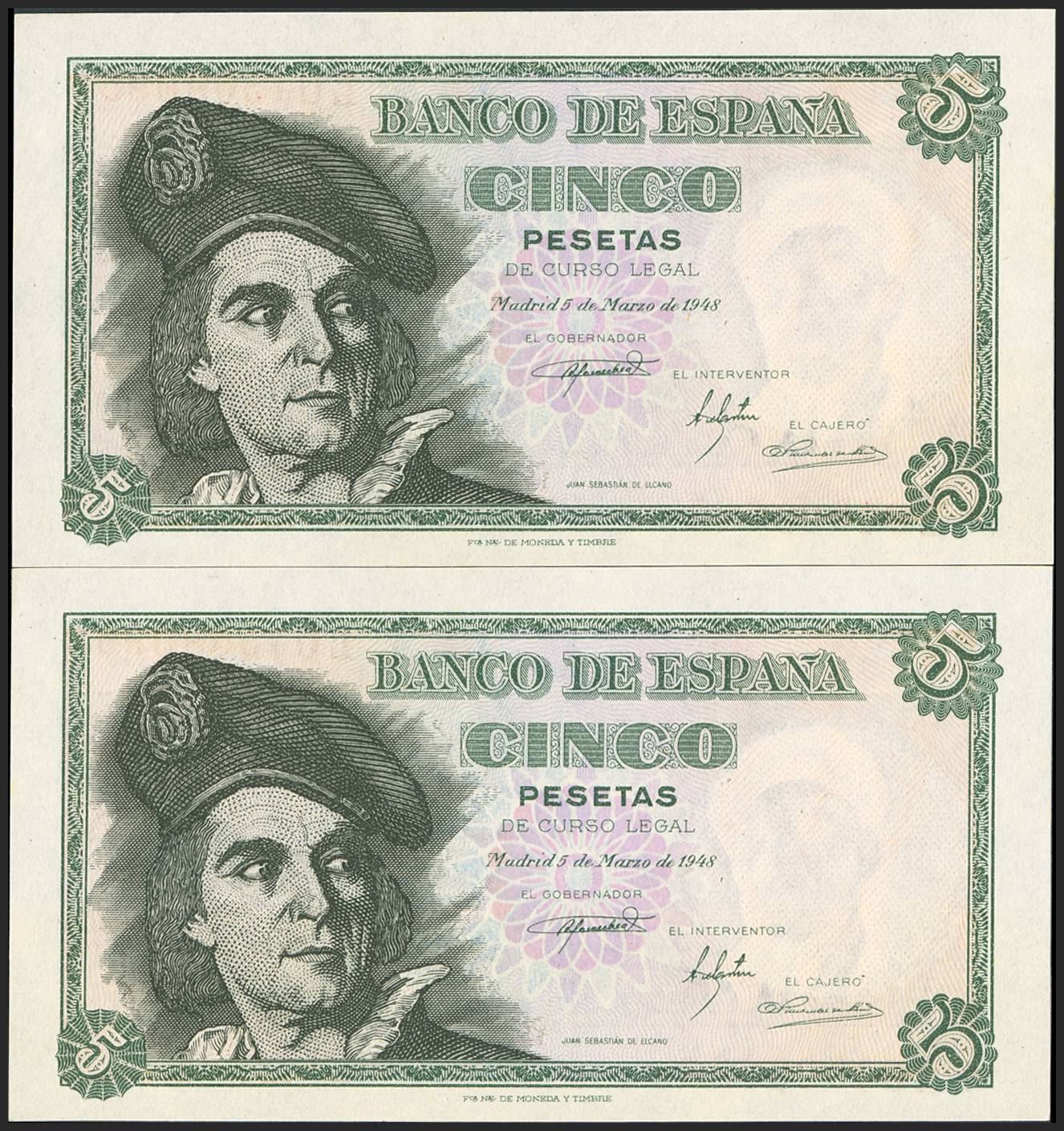 5 Pesetas. March 5, 1948. Consecutive pair. Series L. (Edifil 2023: 455a). Original finish. Uncirculated.