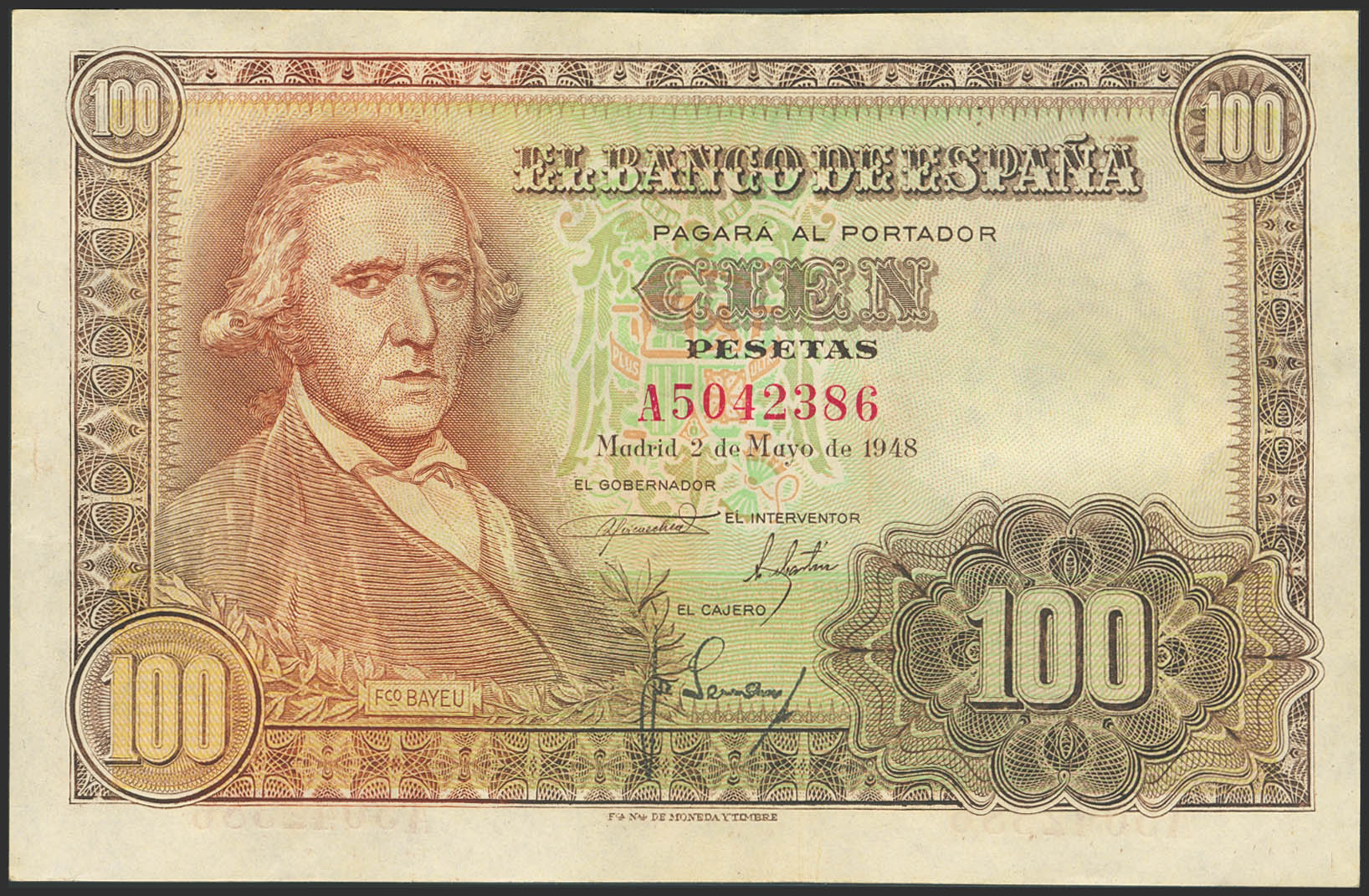 100 Pesetas. May 2, 1948. Series A. (Edifil 2023: 456a). Retains some of its original finish. EF+.