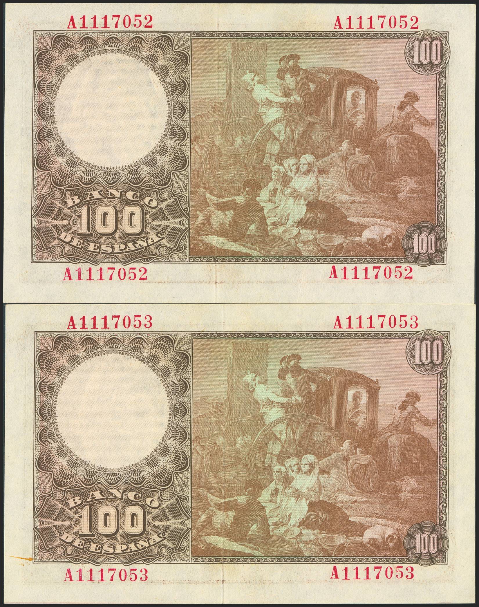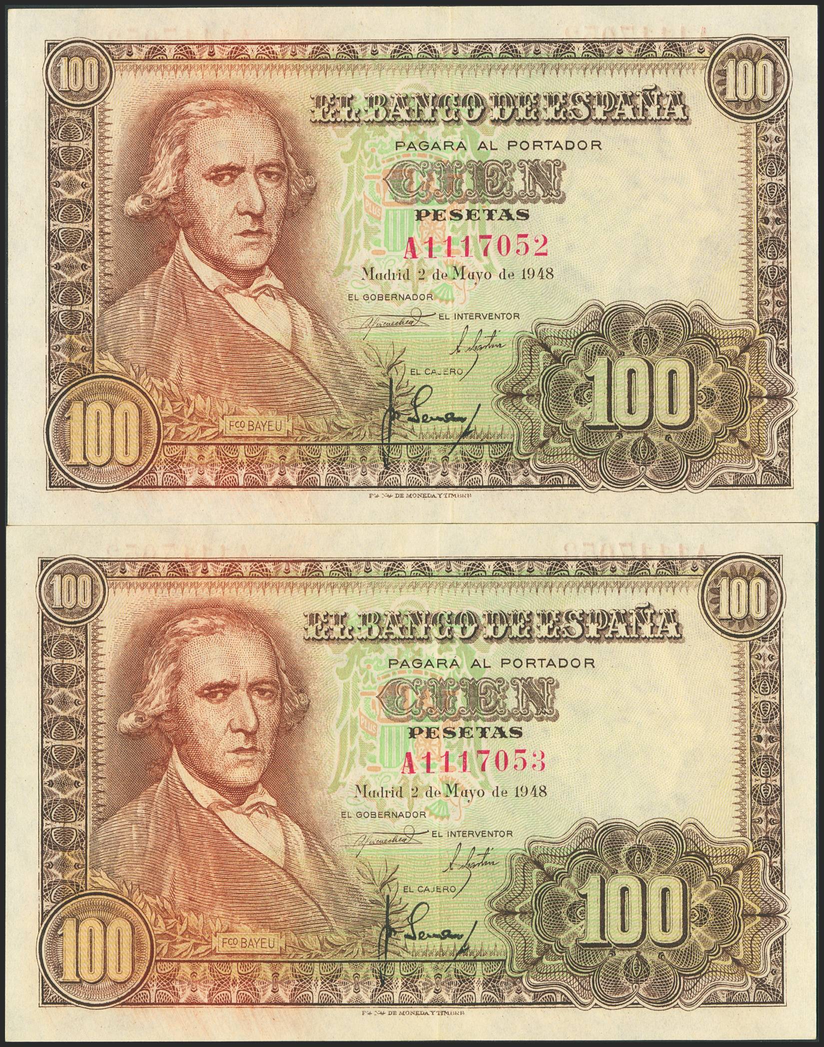 100 Pesetas. May 2, 1948. Consecutive pair. Series A. (Edifil 2023: 456a). They retain much of their original finish. Uncirculated--.