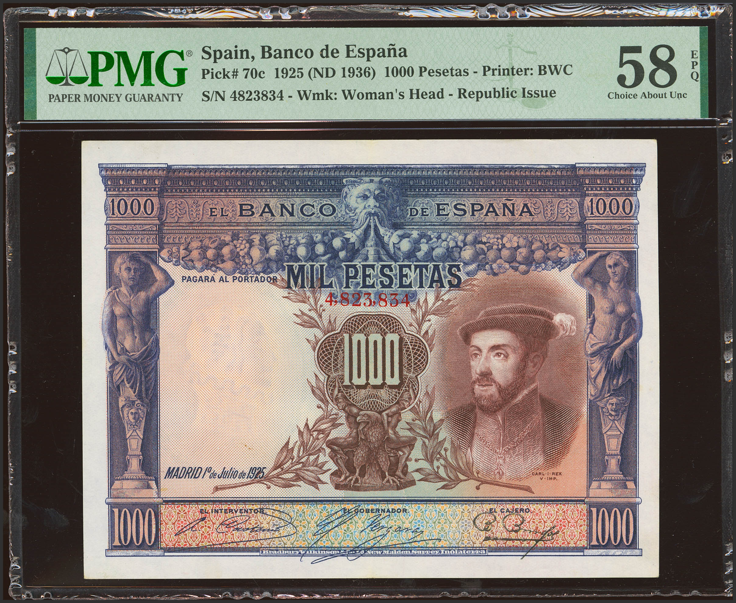 1000 Pesetas. July 1, 1925. No serial number higher than 3646000. (Edifil 2023: 351, Pick: 70c). Unusual in this condition, original finish. EF+++. PMG58EPQ capsule.