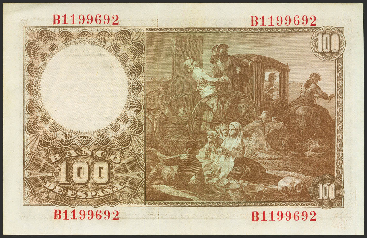 100 Pesetas. May 2, 1948. Series B. (Edifil 2021: 456a). Retains some of its original finish. EF+.