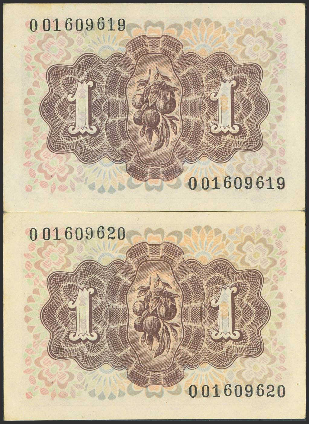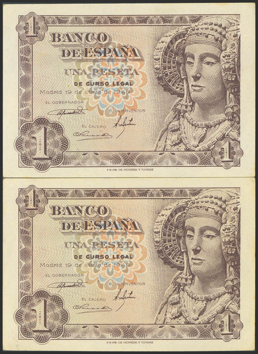 English 1 Peseta. June 19, 1948. Consecutive pair. Series O, last series issued. (Edifil 2023: 457b). Original condition. Uncirculated-.
