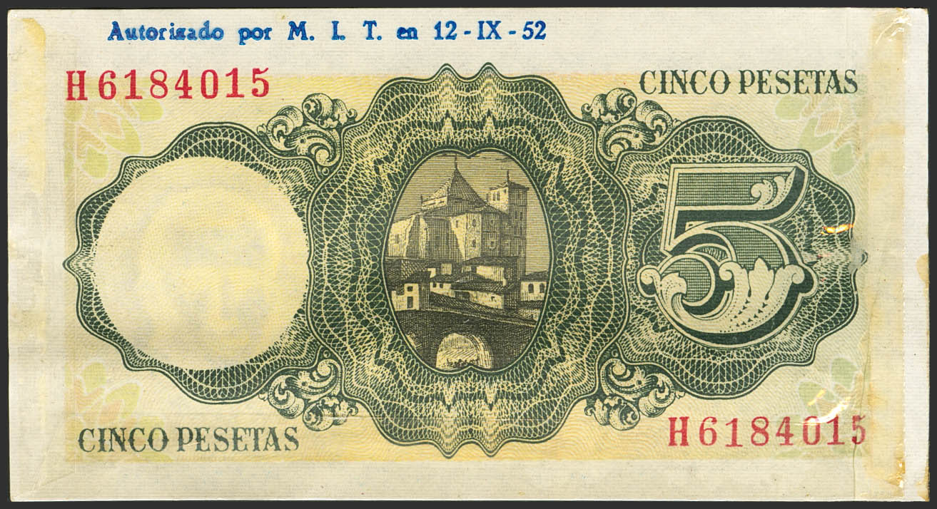 5 Pesetas. August 16, 1951. Series H and with "Borotalco Ausonia" advertising, the banknote is presented inside a cellophane bag where the advertisement is printed. (Edifil 2023: 459a). Original finish. Uncirculated-.