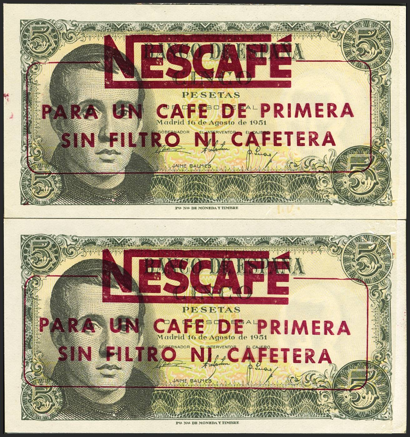 5 Pesetas. August 16, 1951. Consecutive pair. Series 1E and with advertising "Nescafe for a first-class coffee without filter or coffee maker", the banknote is presented inside a cellophane bag where the advertising is printed. (Edifil 2023: 459a). Original finish. Uncirculated-.