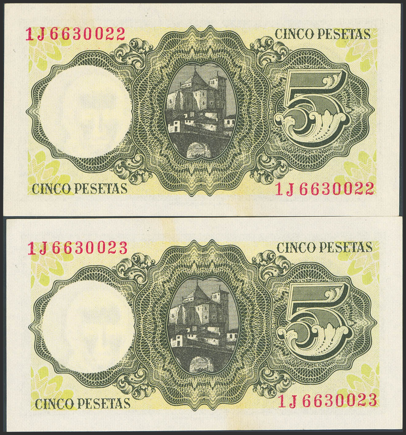 5 Pesetas. August 16, 1951. Consecutive pair. Series 1J. (Edifil 2023: 459a). Original finish. Uncirculated.