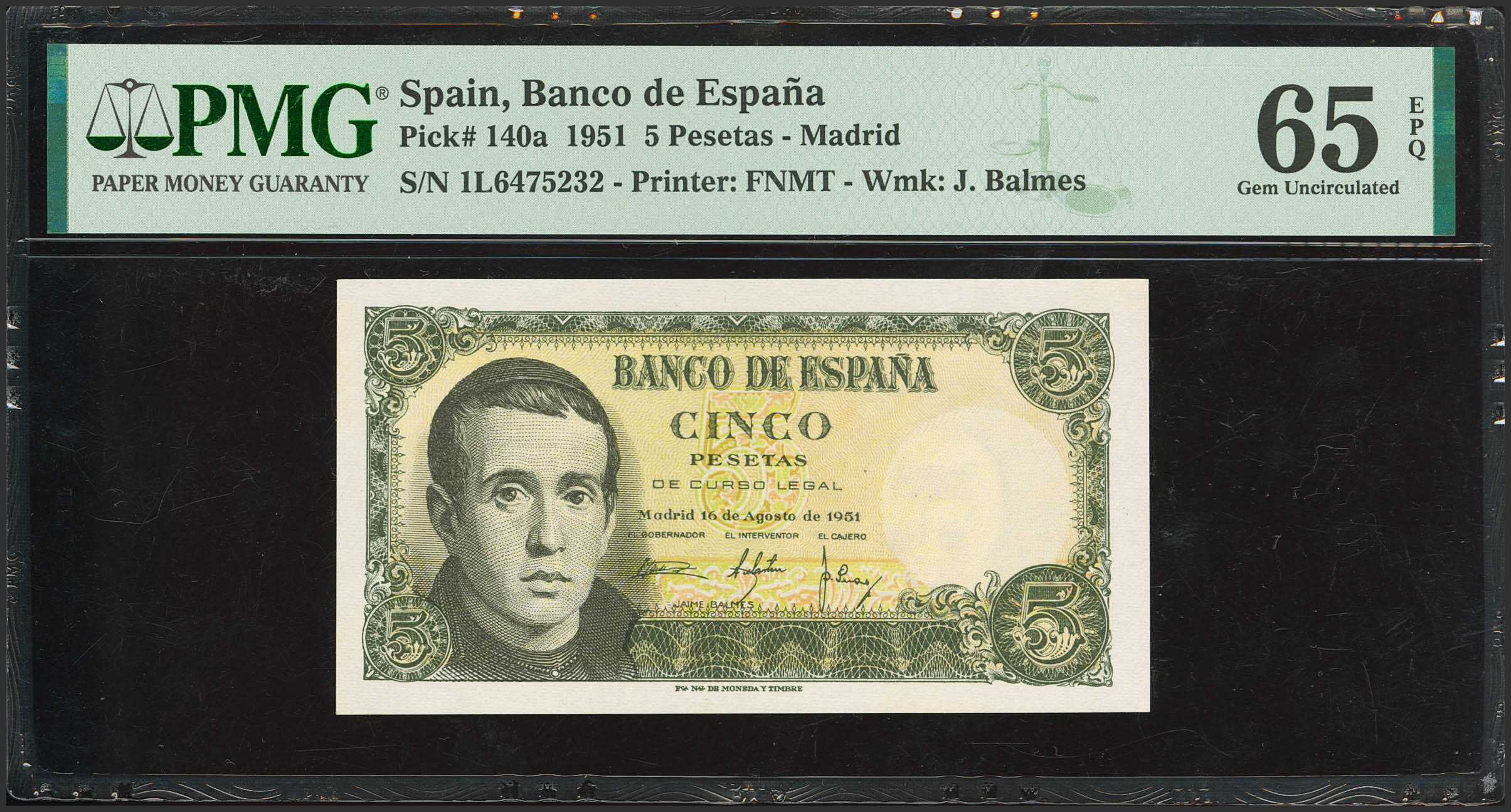 5 Pesetas. August 16, 1951. Series 1L, last series issued. (Edifil 2023: 459b, Pick: 140a). Original finish. Uncirculated. PMG65EPQ capsule.