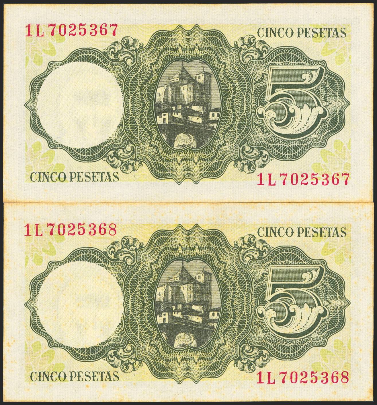 5 Pesetas. August 16, 1951. Consecutive pair. Series 1L, last series issued. (Edifil 2023: 459b). Age stains and original finish. Uncirculated--.