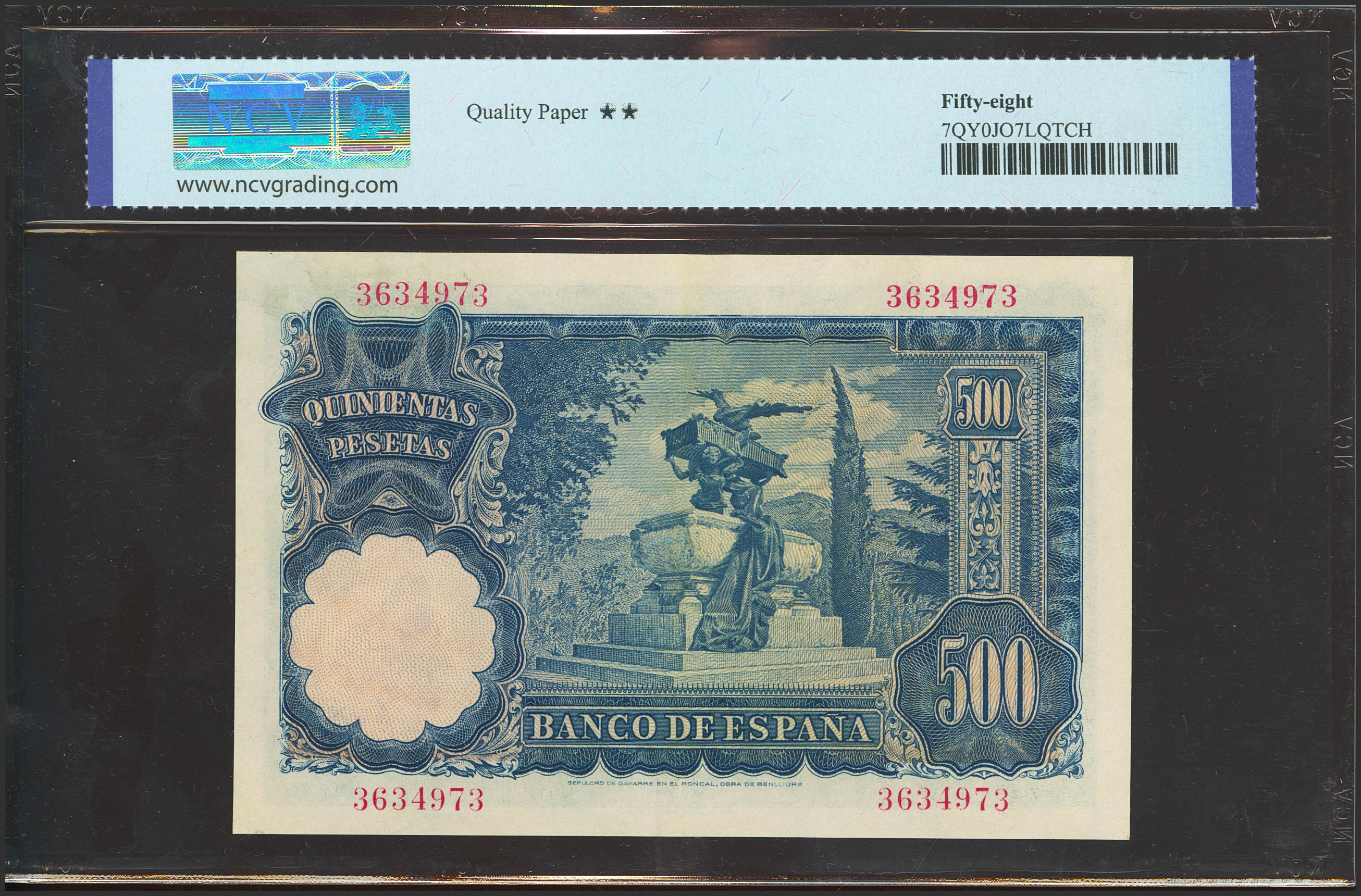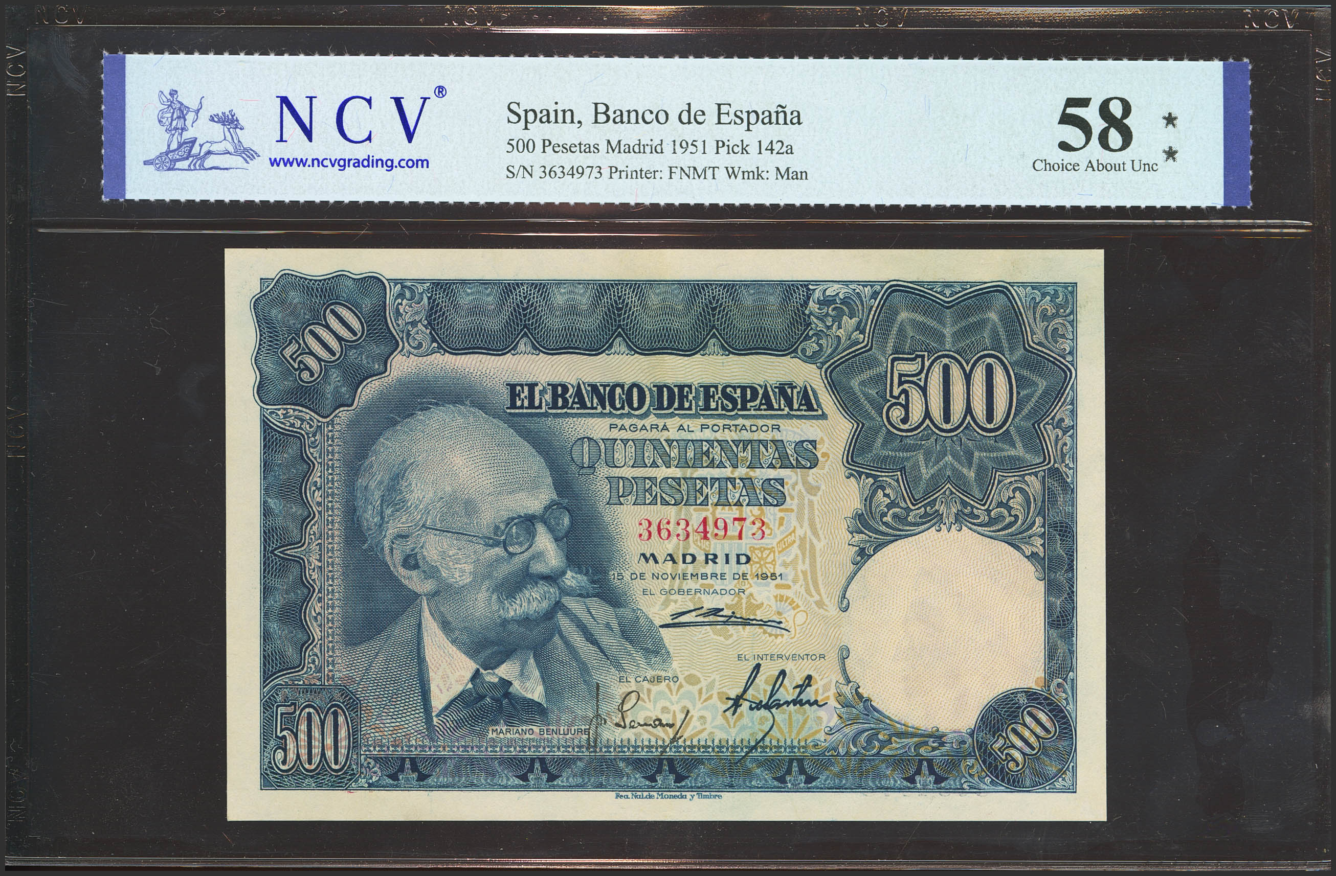 500 Pesetas. November 15, 1951. No serial number. (Edifil 2023: 460, Pick: 142a). Original finish. Good Extremely Fine+. NCV58 package.